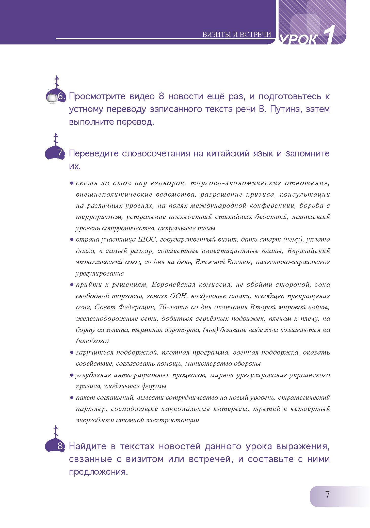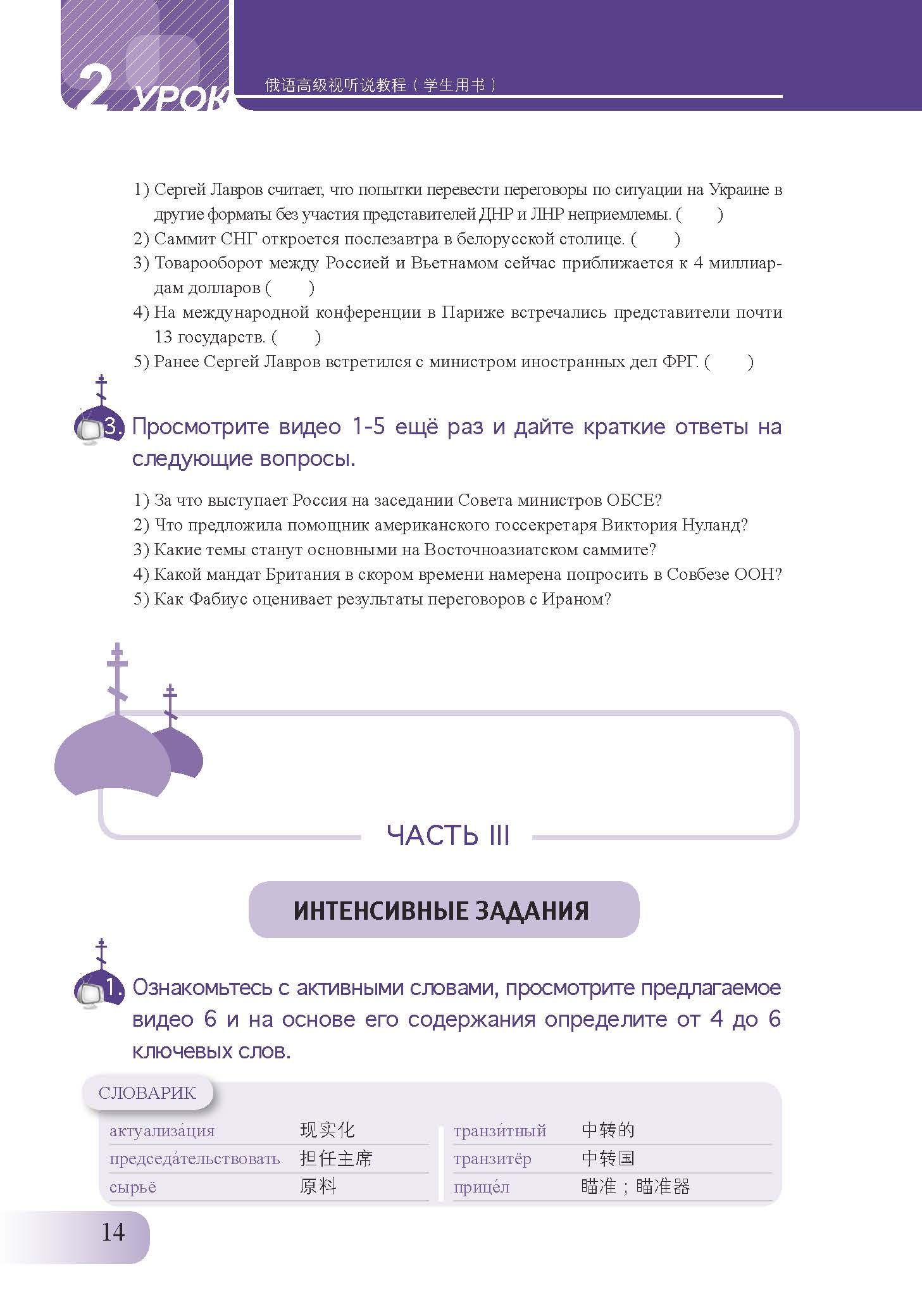 《俄语高级视听说教程学生用书》教材中的选材标准是以新闻报道为主,同时结合采访讲话和专题片,主题涉及访问会见、国际时事、国内政治、安全军事、事故灾害、经济科技、社会文化等,主题设计既参考俄罗斯新闻报道的主流分类体系,又考虑到实际的教学需要。新闻内容既触及俄罗斯国内生活的方方面面,又涵盖国际热点,同时又单列出了中国专题。所收新闻素材权威性强,取自于俄罗斯和中国重要的电视媒体,语言规范,语汇丰富,共约450个音视频素材,语料丰富,练习形式多样,循序渐进,同时还提供了素材的慢速听力材料。