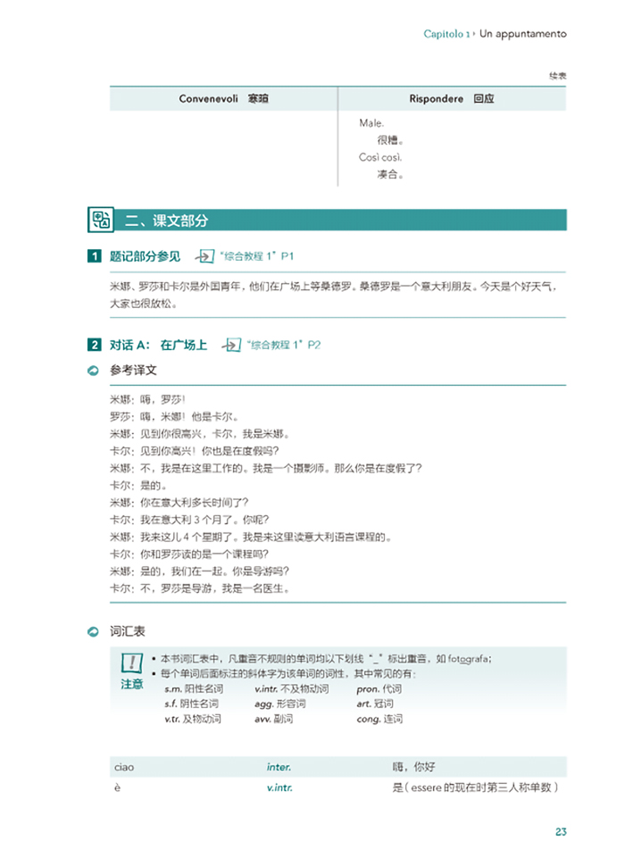 《走遍意大利 学习辅导 1 (A1-A2)》配套《走遍意大利 综合教程 1 (A1-A2)》,包括以下内容:第〇章语音,介绍了元音、二合元音、辅音的发音方法,分音节规则、重音规则等语音规则。第一章到第七章,是与《走遍意大利 综合教程 1 (A1-A2)》配套的单元重点内容梳理、课文讲解、写作讲解、文化讲解。本册附有《走遍意大利 综合教程 1 (A1-A2)》的"总词汇表""练习答案""听力原文""教师指导"。
