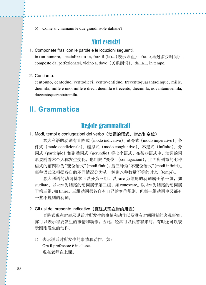 “大学意大利语教程”是中国大学本科意大利语专业一、二年级的综合训练型教材,其教学目的是,在全面培养学生听、说、读、写等基本语言运用能力的同时,向学生传授基础语法规则和文化知识,为学生进一步提高语言水平打下坚实的基础。根据中国大学的教学体制,整套书分为4册,每册书又分为16课,共计64课。