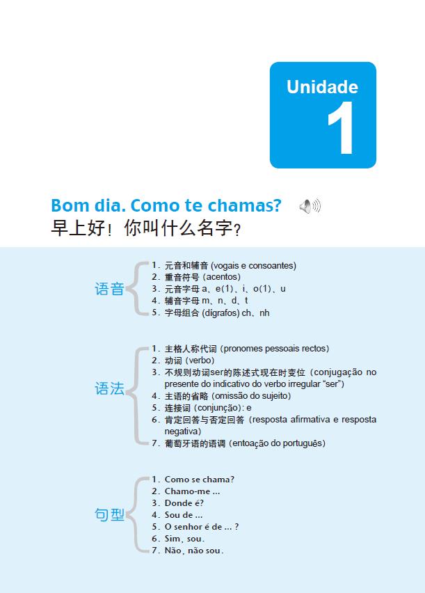 《大学葡萄牙语1》为了增加学生的学习兴趣,同时也为了更多地介绍相关的文化知识,除了在课文中穿插一些历史、文化内容以外,还在每个单元的最后安排了一首葡萄牙或巴西著名诗人的经典名诗。这些诗歌,授课老师可以做简单的讲解,然后要求学生尽可能背诵。一年级是学习基础知识和基本技能的阶段,因此,在内容的编排上主要围绕着日常生活场景而进行,内容包括问候、打招呼、相互介绍、描述他人、职业、家庭、室内描述、日常生活、业余爱好、天气、过生日、外出游玩、介绍自己的学校、童年、问路、邮局、银行、购物、餐馆、看病、酒店、机场、就业面试、租房、书信等,尽可能涉及生活的方方面面。
