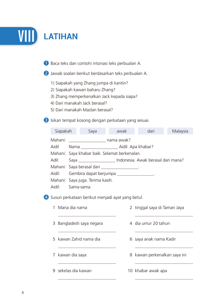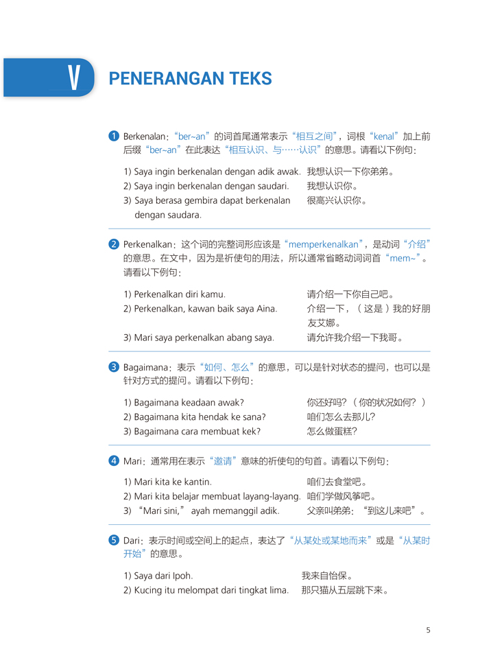 5、具有鲜明的交际特色。课文内容的撰写以标准的马来语语法为准则,培养学生的正确的语言使用习惯。同时在重点难点注释部分,标注出标准语法使用规范与实际口语使用的差别,例如俚语、缩略语、混合语码、变音等现象;