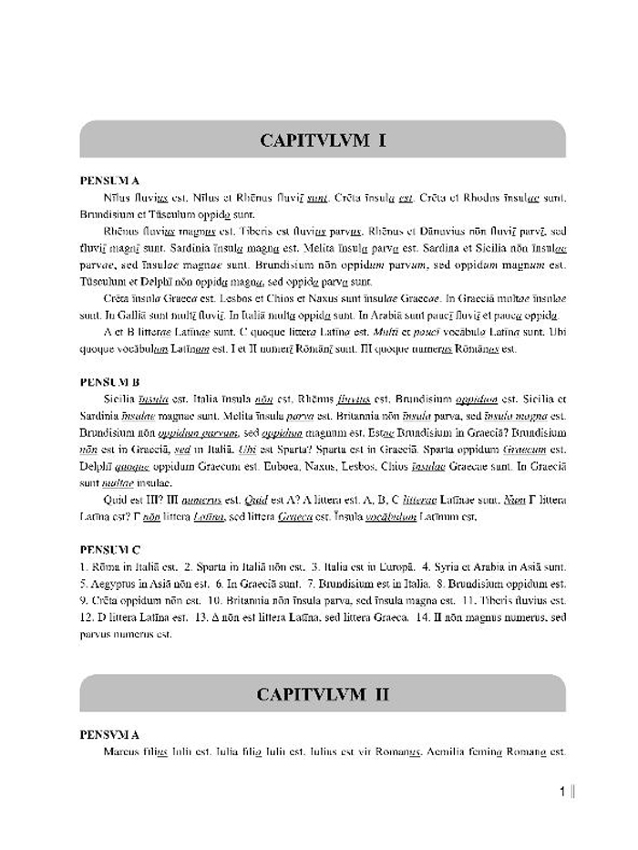 内容全部为拉丁语,避免其他语言的翻译。每章课文后有一段简明的语法讲解(GRAMMATICA LATINA)以及三道练习题(PENSVM)用来巩固课文理解和语法知识。