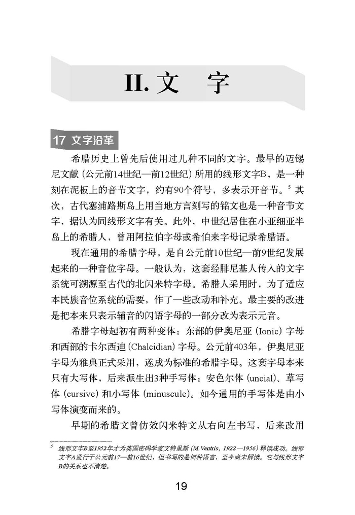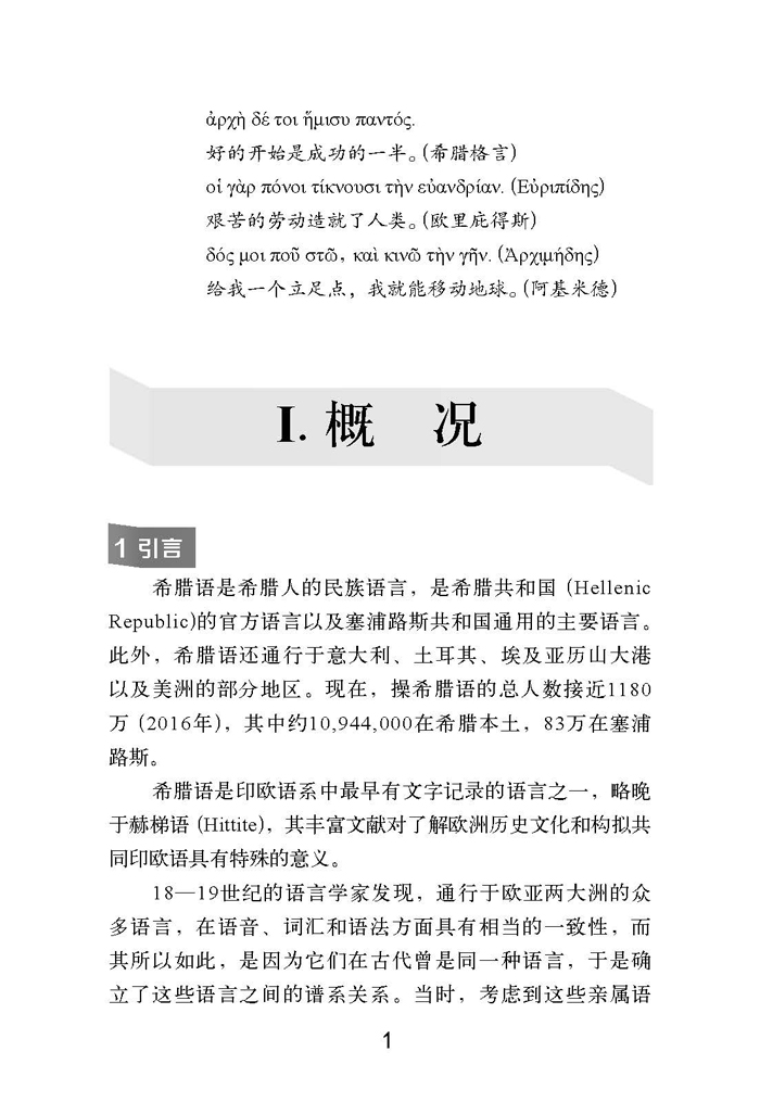 书中在概述印欧语系的基础上,介绍了希腊语的历史背景、文字沿革、语音、形态、构词和句法。每条语法规则都有足够的例证,所有例句都附译文,单词的形式和意义都有注释,有些地方还借用英语来辅助解释。书中凡有关联的内容都注明参见的节码,以便于通读或选读、精读或浏览。书末附有现代希腊语简介(见附录Ⅱ)、术语索引、希腊语词汇索引、汉语—希腊语词汇表以及英语词汇索引。