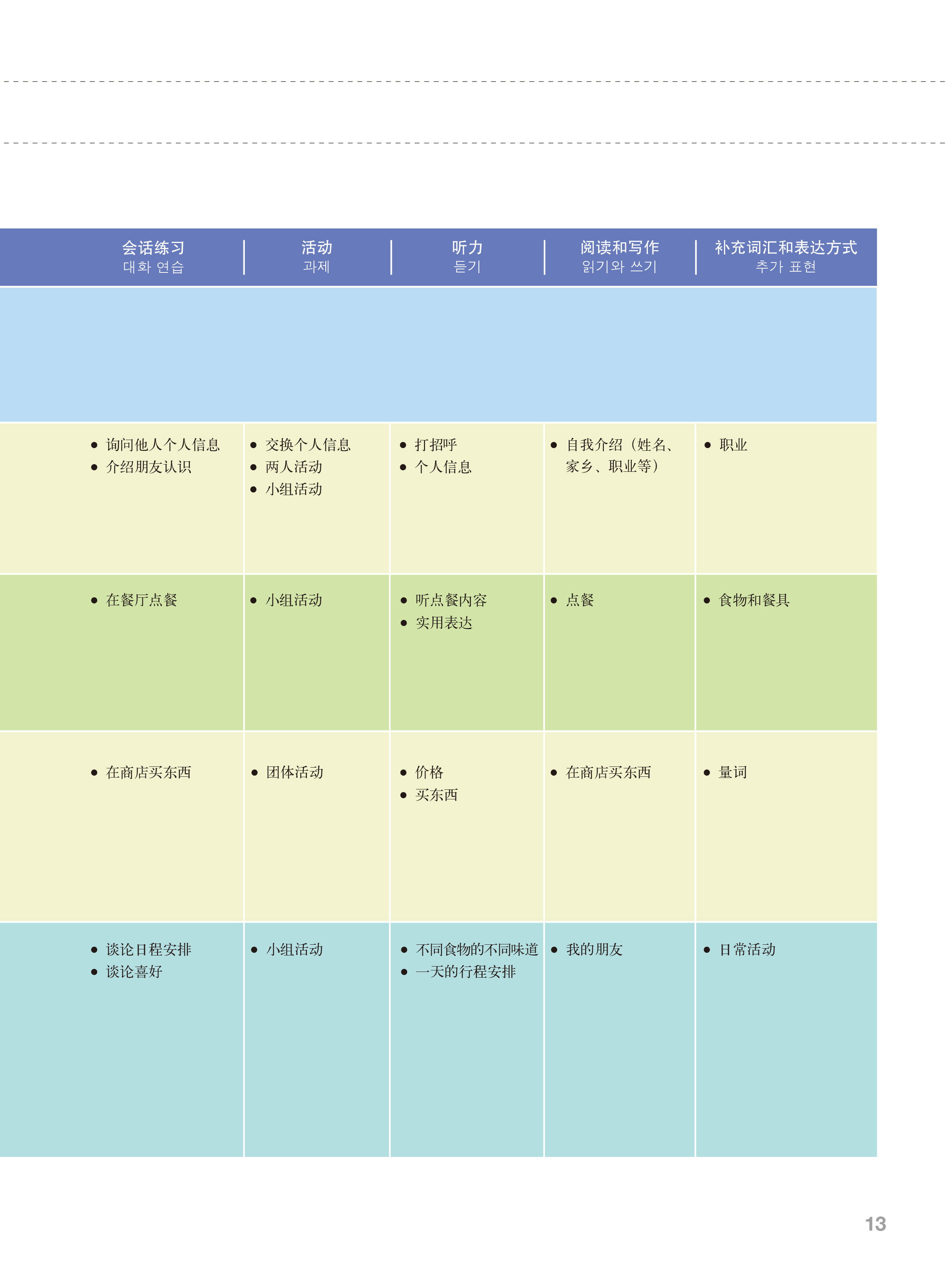 本教材共分4册,内容从基础的语音开始讲解,循序渐进,涵盖了日常学习、生活的各个方面,实用性强;词汇和语法讲解详细,易于掌握;