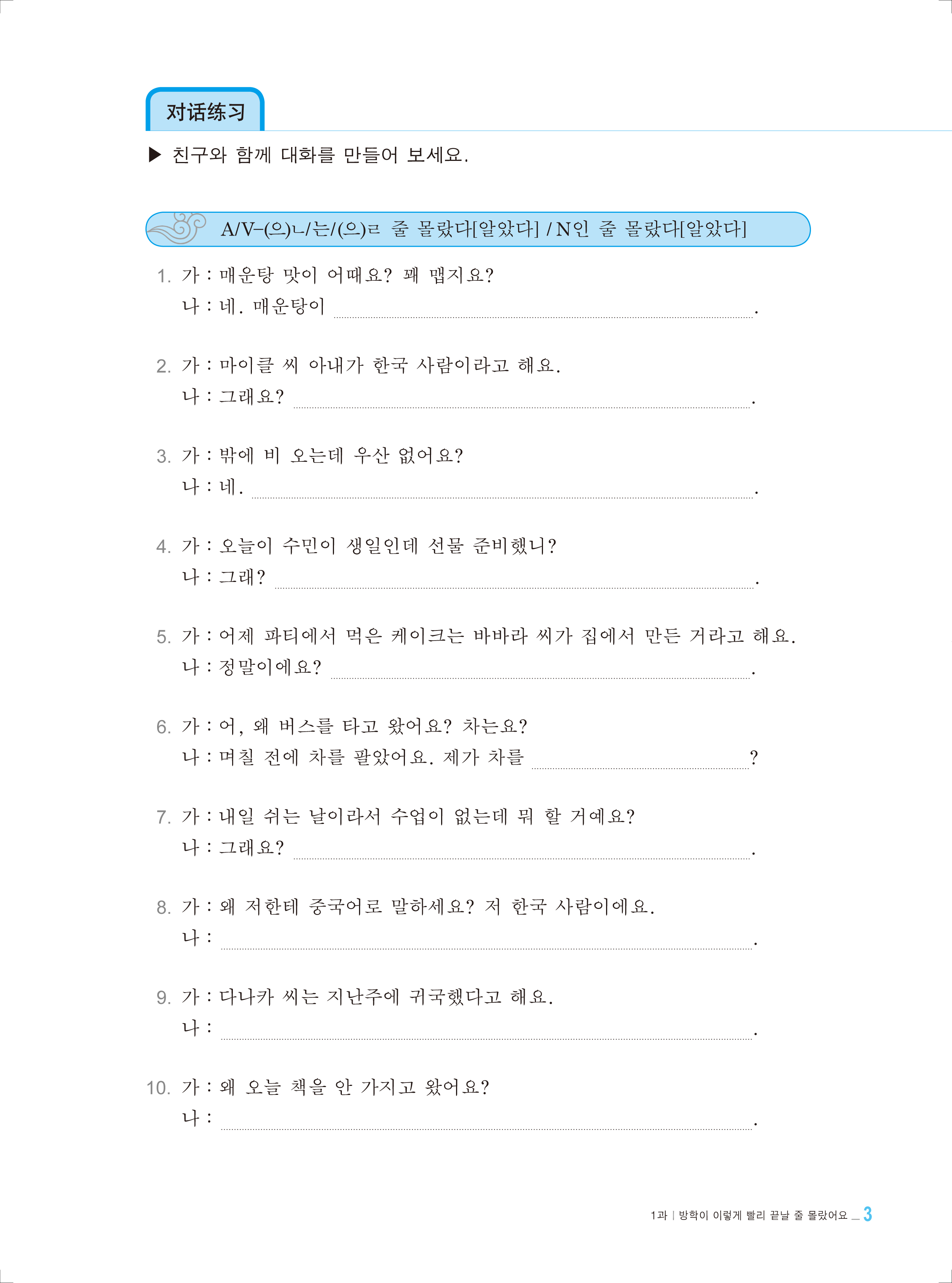 《韩国语3同步练习册》是首尔大学语学研究所专为学习韩国语的外国成人学习者编写的韩国语系列教材中初级阶段的教材。本书以完全没有韩国语基础的成人学习者为对象,以培养日常生活中必须的基础的语言沟通能力为目标。全书由30课组成,每课均包括课文、发音、语法、词汇(11课以后为词汇和表达)和练习等内容。