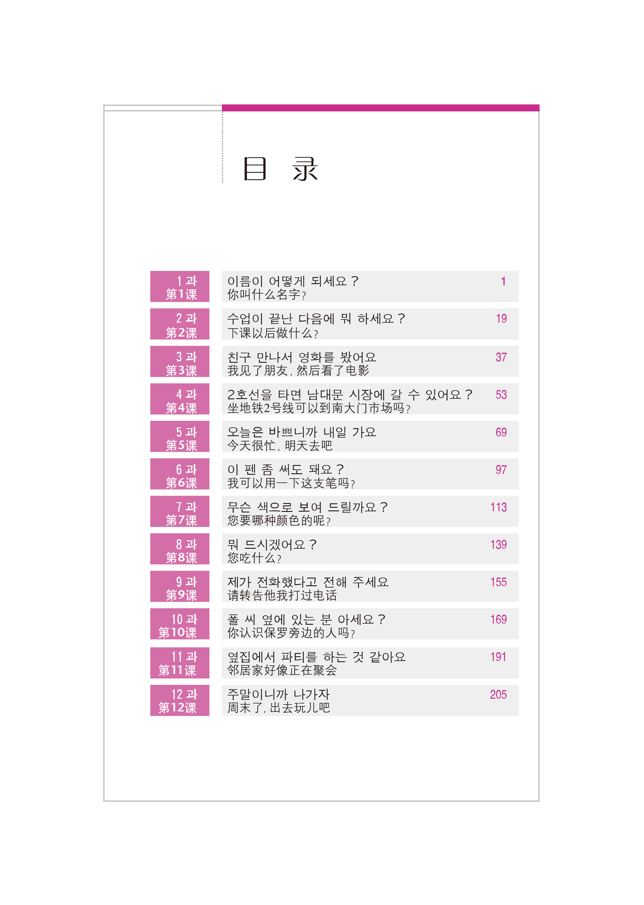 本练习册内容丰富,以初中级语法知识为主,包括主教材16课每一部分的单元练习,逐步提高学生应用韩国语初中级语法的能力。