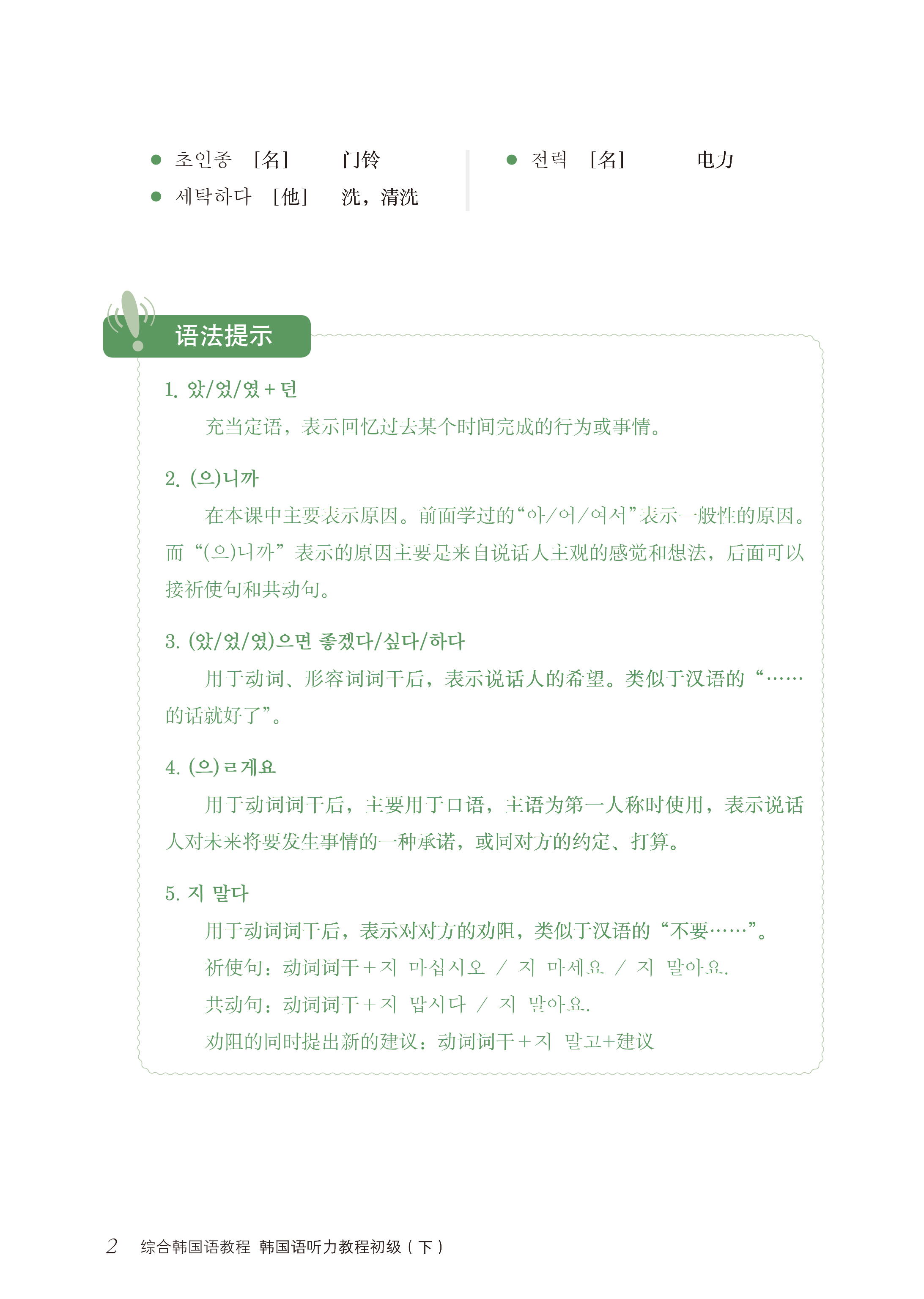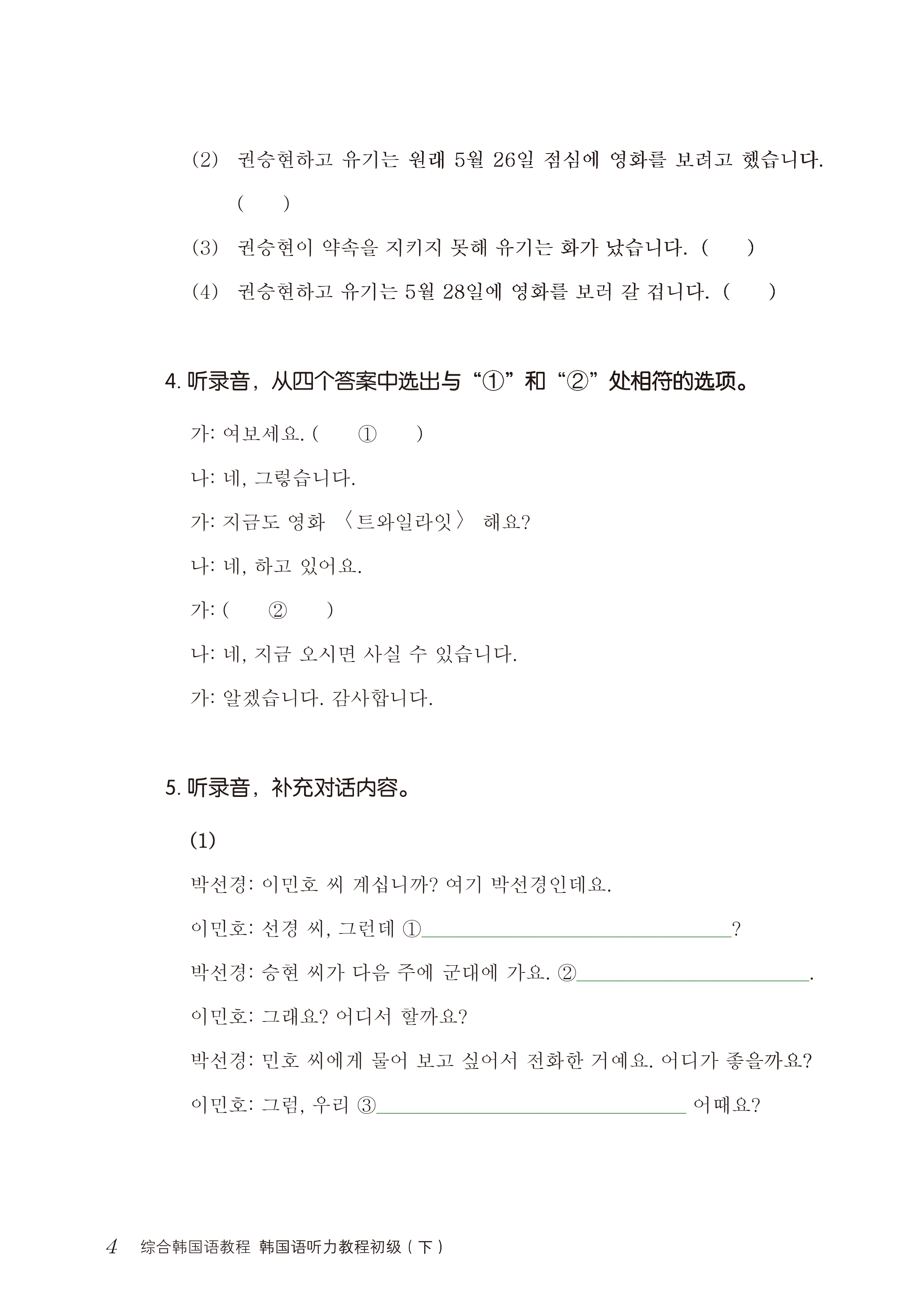 《韩国语听力教程初级下》适合韩国语专业一年级下学期学生使用。内容包含了日常生活中各类场景下的常用会话。如打电话、乘坐交通工具、购物、留学生活等。《韩国语听力教程初级下》系“综合韩国语教程”系列教材之一。该系列教材内容生动、活泼,贴近生活;语言纯正、地道。有如下两大特色:1.练习形式丰富多样,便于学生通过反复联系提高韩国语听力水平。2.练习听力原文及参考答案单独成册,附于书后,便于教师课堂授课。