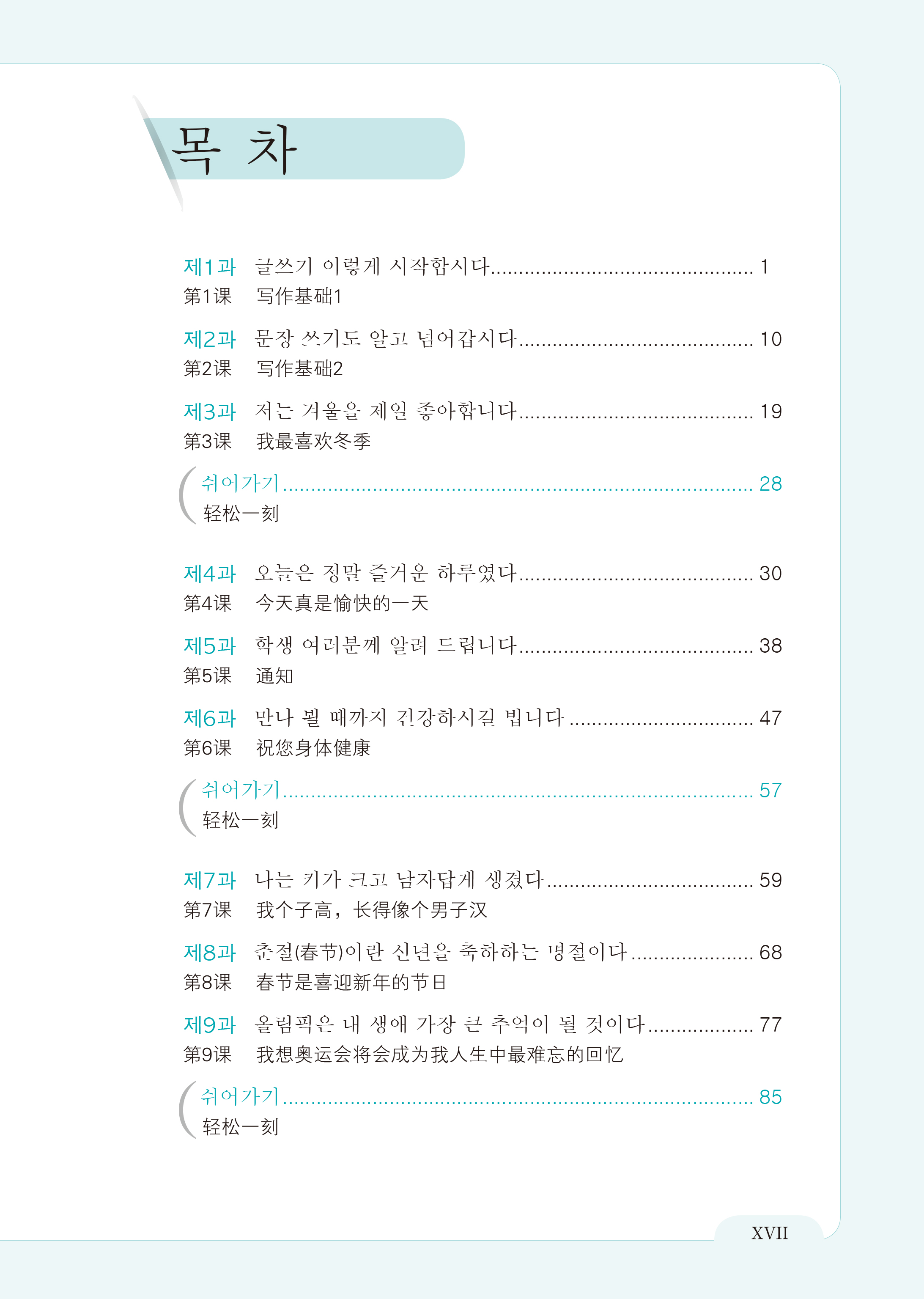 考虑到中国大学的课程设置,教材分成初级和中级两册,每册分15课,一学期完成一册的教学。本教材旨在使中国大学生能用韩文流畅地表达自己的想法,因此主要从中国人的视角开展写作训练。教材中文体类型丰富,使学生能根据写作目的选择不同文体进行学习。