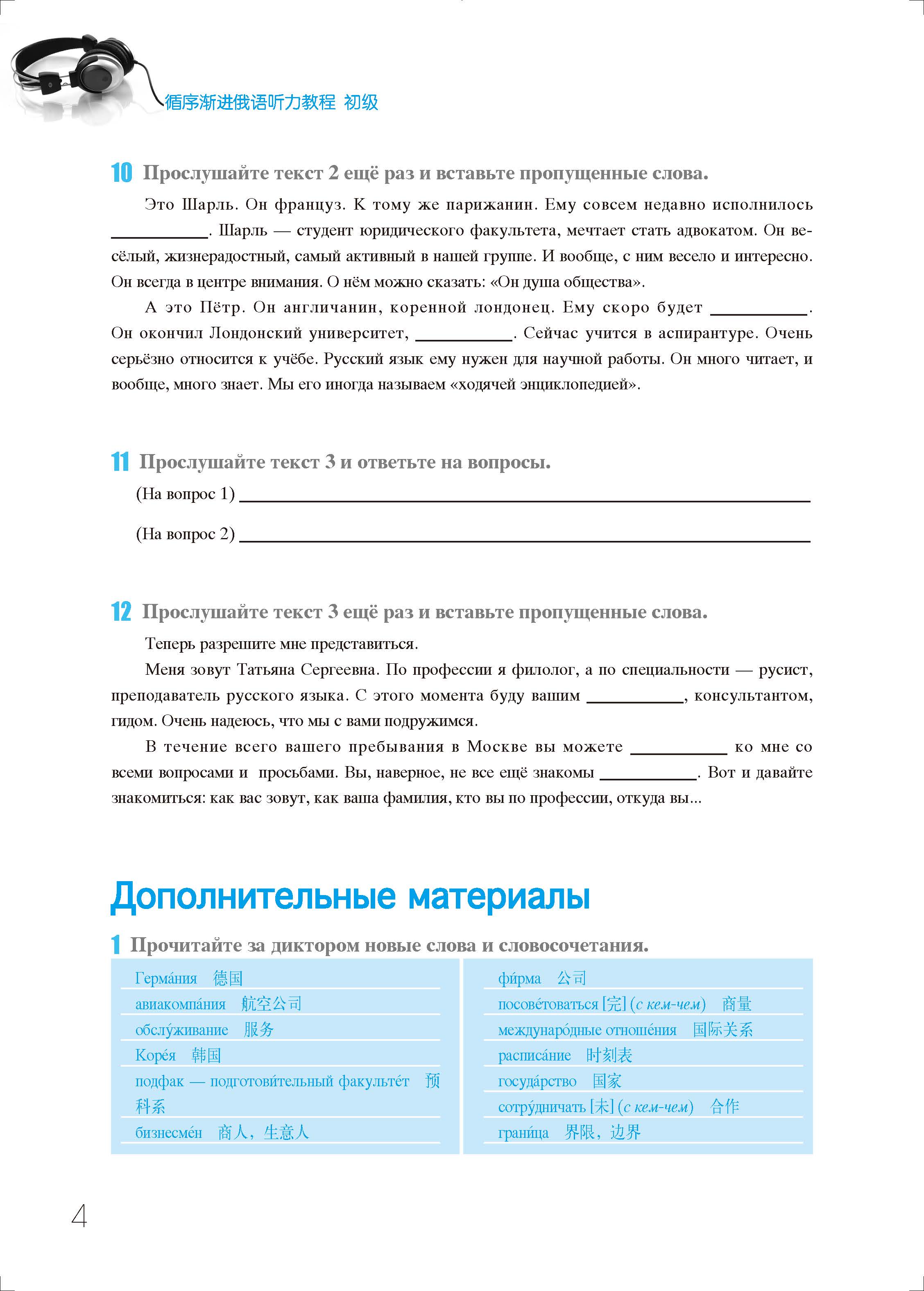 《循序渐进俄语听力教程》共两册,每册20课,编排的主题涵盖日常生活和学习、境内外旅游、交通、住宿、订餐购物、休闲等40个场景。每课编排3个对话和3篇短文。初级教程中对话和课文的词汇量一般为50~100个词,中级教程为100~150个词。每5课为一个单元,每个单元后配有相应的测试题,全书后配有总测试题。本教材所设置的练习题形式多样,其中,选择性练习可帮助学生培养捕捉主要信息的能力;回答问题和填空等练习可帮助训练学生的语言基本功。