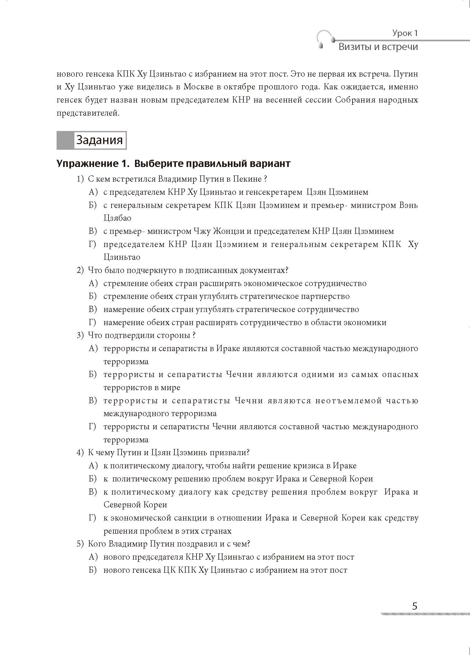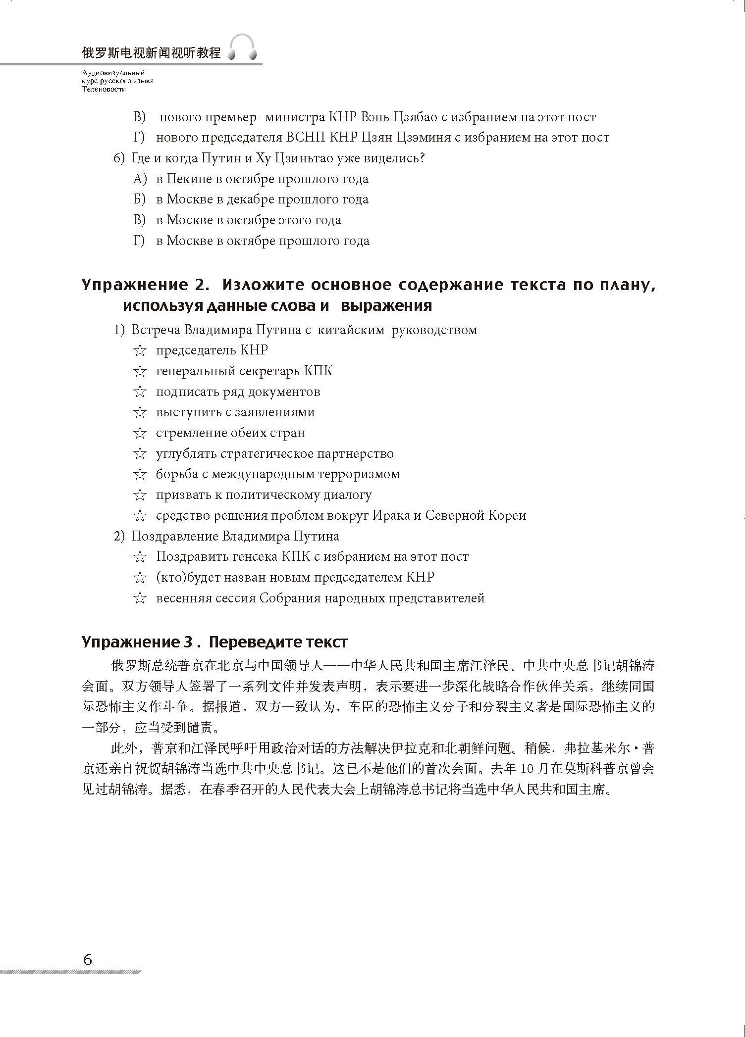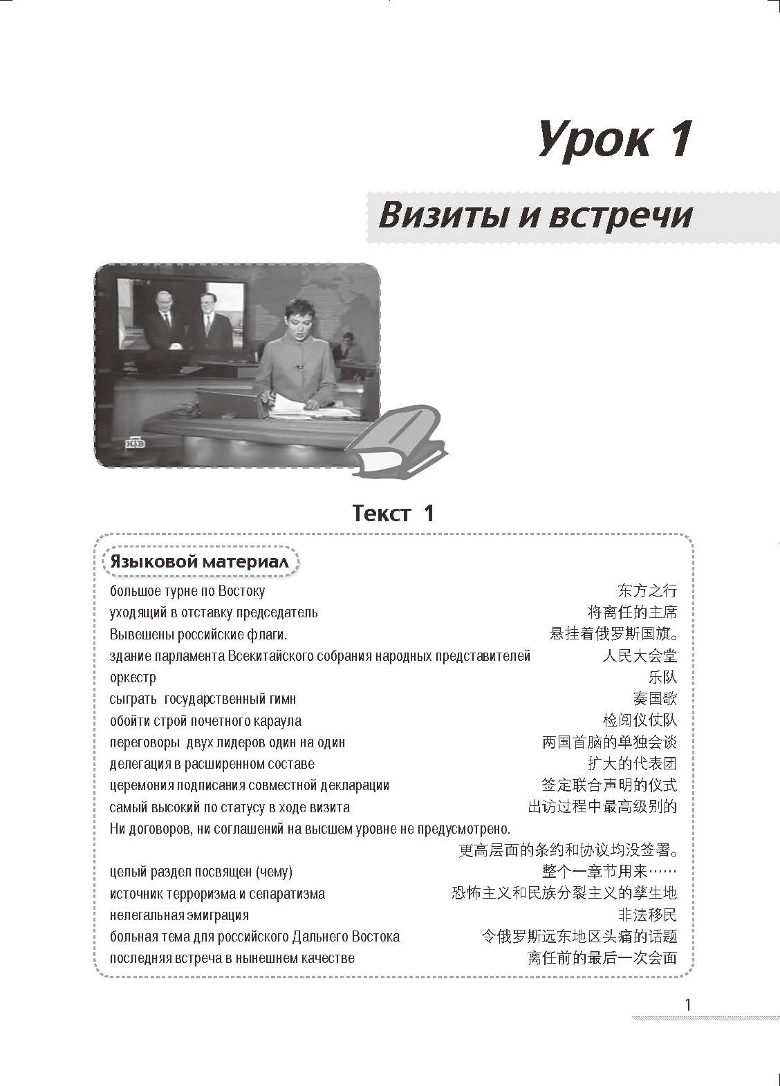 本教材内容分以下八个专题:出访与会见、自然灾害、政策、选举、法律、国际事件、军事冲突、经济。每个专题为一个单元,由20篇左右篇幅不等的课文组成。每课结构为:1)词汇;2)课文;3)练习(回答问题、填空、选择、改错、连词成句、转述、翻译)。
