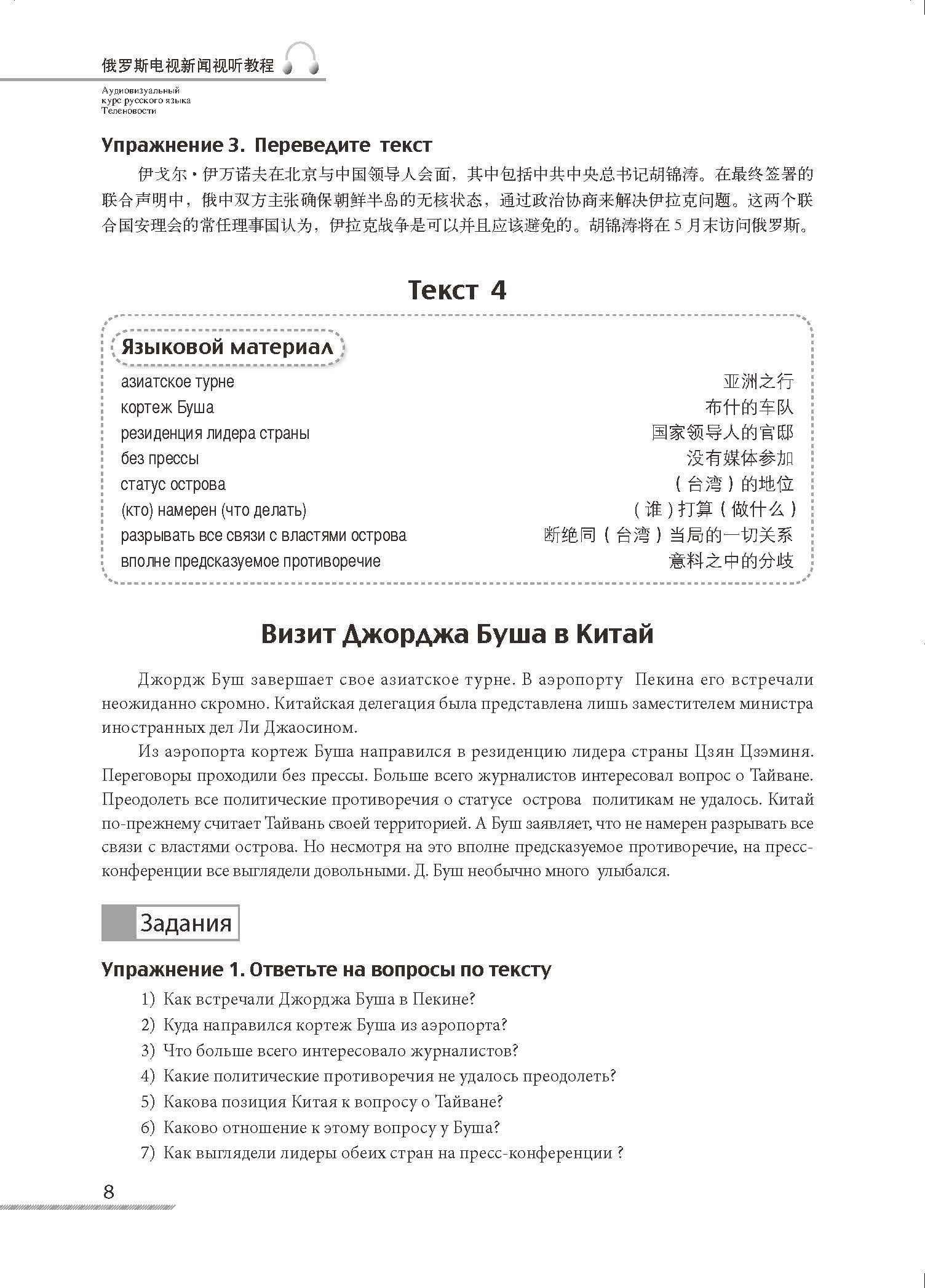 本教材内容分以下八个专题:出访与会见、自然灾害、政策、选举、法律、国际事件、军事冲突、经济。每个专题为一个单元,由20篇左右篇幅不等的课文组成。每课结构为:1)词汇;2)课文;3)练习(回答问题、填空、选择、改错、连词成句、转述、翻译)。