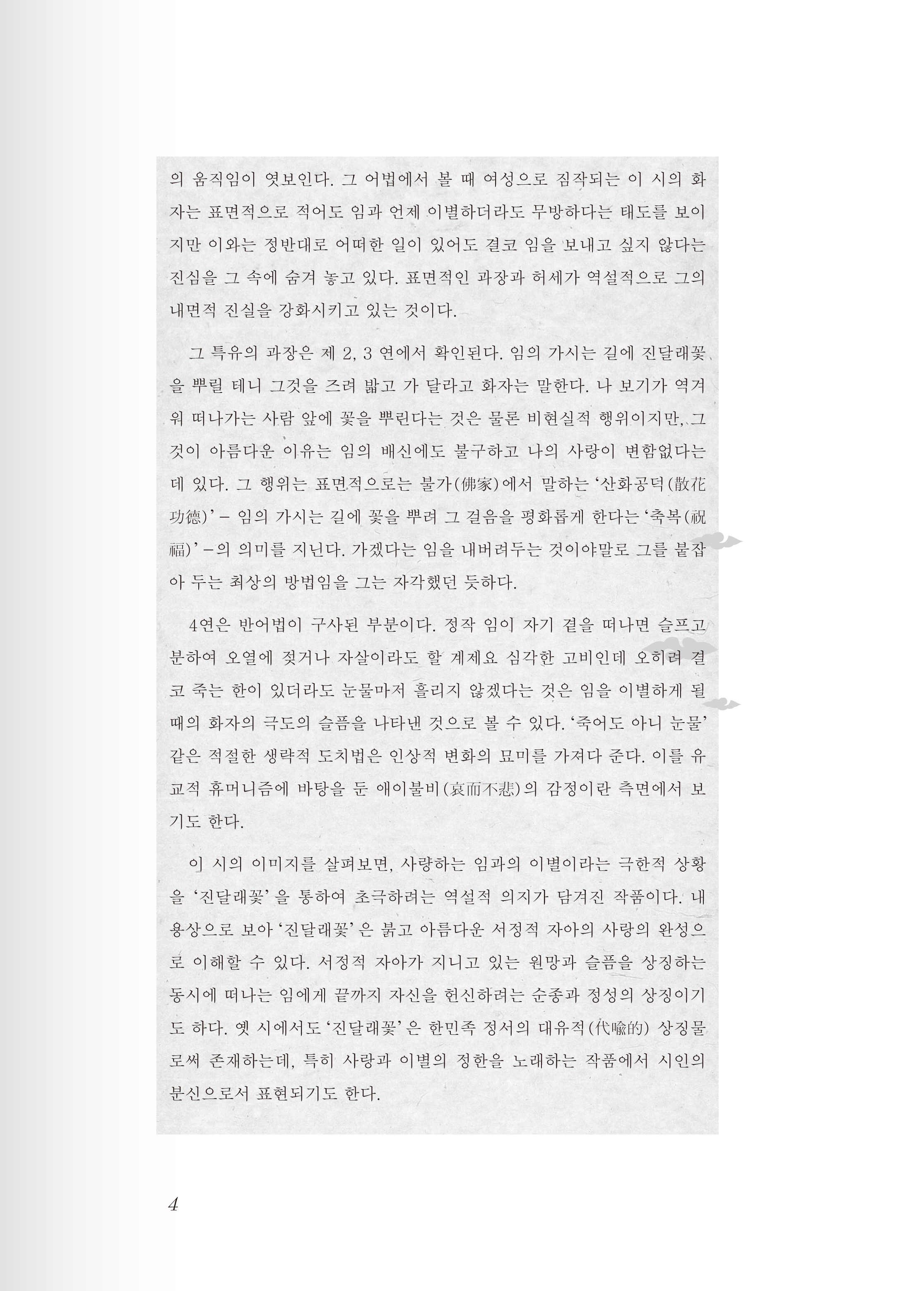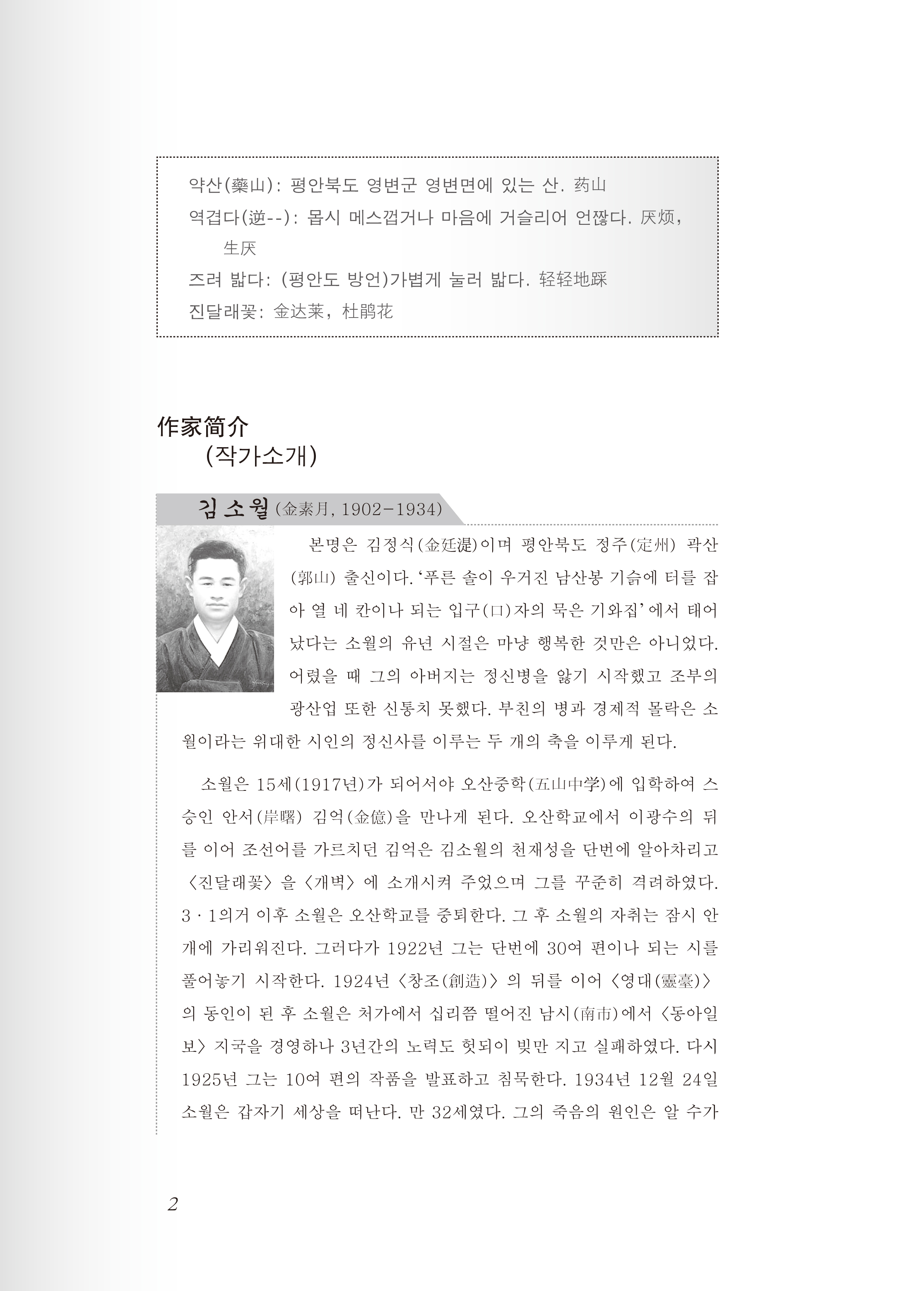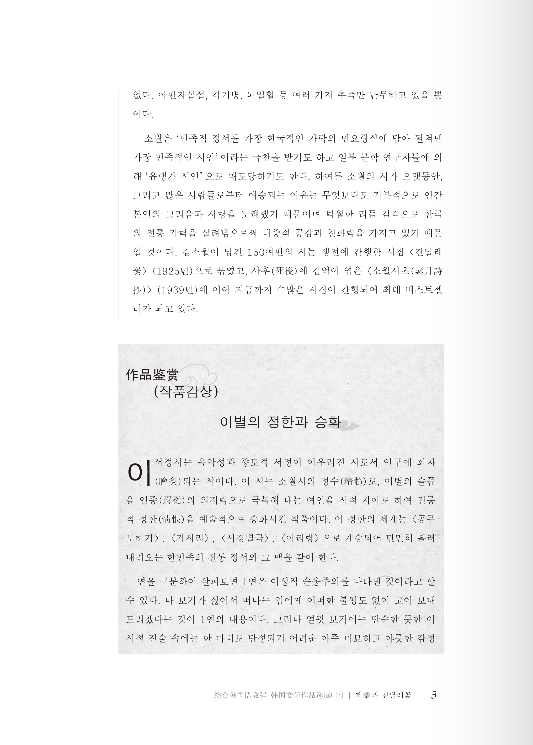 《韩国文学选读教程(上)》旨在提高学习者对当代韩国人和韩国文化的认知度,为中韩两国的文化交流和世代友好发挥积极的作用。在范文的选择上兼顾思想性、艺术性和可读性,小说节选作品中精彩的段落,而诗歌则采用作品加评论文的方式以加深理解。另外,课文的编排次序一律依照作品的写作年代或发表年代之先后,以与韩国文学发展史同步,同时插入相关作家作品的图片以提高阅读学习之效果。