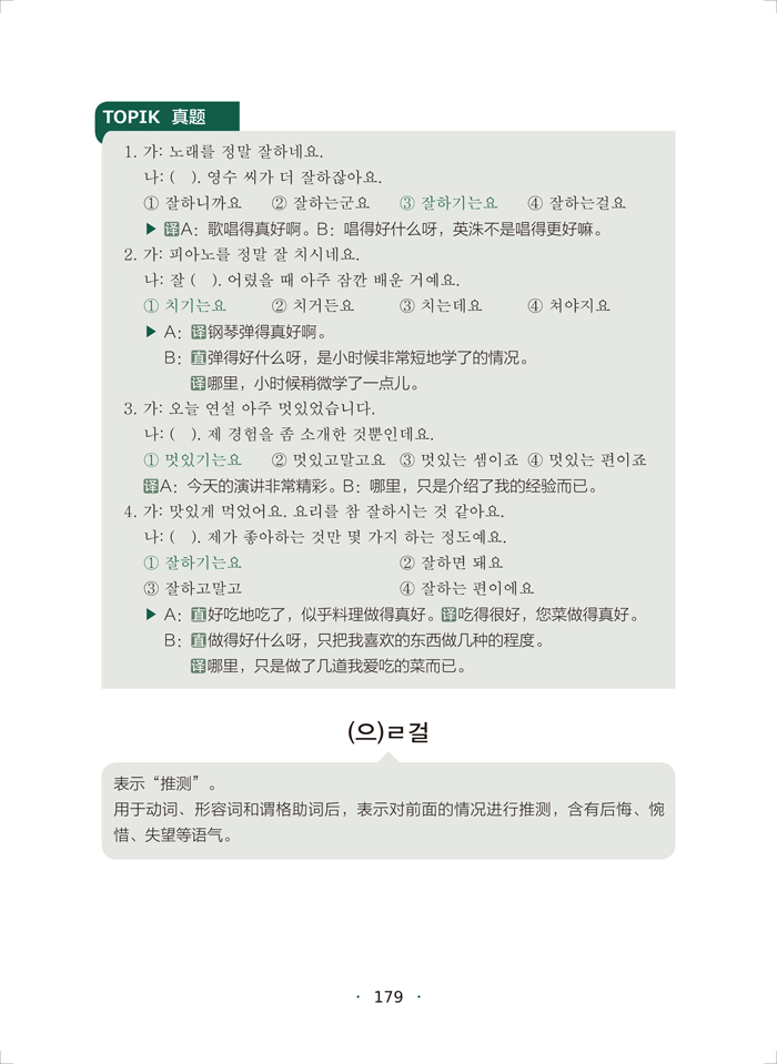 《韩国语实用语法教程中级-NEW TOPIKII必备语法+实战训练》精选出学习者在学习韩国语的中高级阶段和准备新韩国语能力考试中高级(TOPIKⅡ)时必须掌握的150 个语法点,包括19 个助词、41 个词尾和90 个惯用型三个部分,对其进行详细的讲解,深入挖掘语法点的深层含义,便于学习者理解和记忆。同时在多个语法点之间建立联系,减轻学习者记忆的负担。在讲解语法点时,列举大量例句,帮助学习者在具体的语境中理解语法的内涵。另外语法讲解浅显易懂,适合初学者自学。