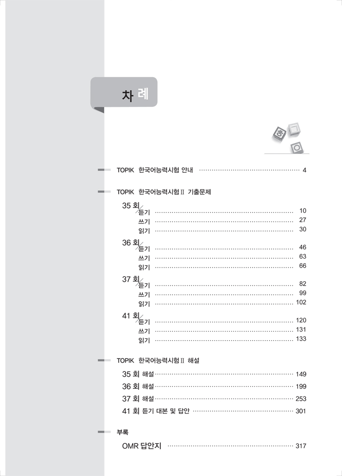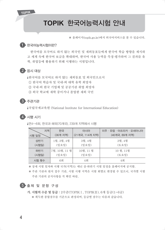 韩国语能力考试(TOPIK)是韩国教育人力资源部主办,韩国国立国际教育院主持实施的旨在测评外国学生韩国语学习水平,为外国人在韩国学习和就业提供语言能力评估的考试。随着中韩两国在文化、教育、经济等领域交流迅速扩大,韩国语能力考试受到人们关注的程度也越来越高。该考试自1998年开始在中国举办以来,每年的考生人数成倍增加。为适应考试需要,从2006年起考试类别从六种(1级—6级)变更为三种(初级、中级、高级)。自2007年开始,考试次数由每年一次增加为每年两次。2014年7月,韩国语能力考试正式改革。考试由原来的初级、中级、高级三种类别改为TOPIK I和TOPIK II两种类别。TOPIK I根据分数分为1级和2级,TOPIK II根据分数分为3级、4级、5级和6级。TOPIK I的内容包括阅读和听力两大部分,取消了词汇·语法和写作部分。TOPIK II的内容包括阅读、听力和写作,取消了词汇·语法部分。韩国语能力考试虽然取消了词汇·语法部分,不再对其进行专项考查,但是词汇和语法是韩国语学习的基础,对这部分的考查贯穿于整个考试中,所以不能放松对这部分的练习。这是韩国语能力考试首次大规模的改革,虽然题型等有所变动,但是考查重点、难点,各个级别需要掌握的内容等并没有太大变化,所以往年考试真题仍然有很大的借鉴意义。