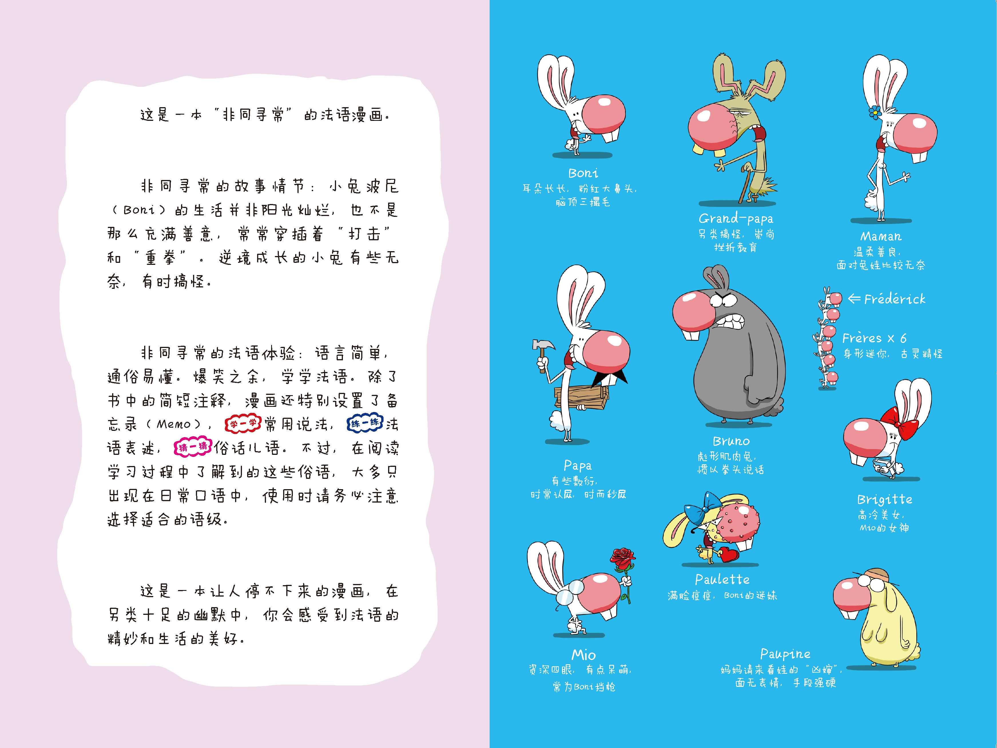《兔子波尼》是"法语‘漫’游"系列中的一册,该系列包含的《兔子波尼》、《无基百科》和《葡萄酒传世之旅》三部漫画,涵盖家庭、幽默、科普等不同主题元素,语言难度从基础级别到中高级不等,不同法语学习阶段的读者(高校法语专业学生、法语选修课学生、青少年及成人学习者)均能从中获益。主要面向大众学习者,专业学习者亦可将其作为辅助提升的材料。《兔子波尼》由中文导读、30个法语原文小故事和中文简注、备忘录(Memo)三部分组成。《兔子波尼》是一本适合A1级以上级别法语学习者的漫画读物。导读部分欢快明了,配有主人公图谱和性格特征,可以帮助读者迅速了解全书基调、内容和框架;法语原文小故事诙谐幽默,语言简单,配合个别中文注释,更加通俗易懂;备忘录的设置可以使读者在阅读同时获得语言学习体验,学常用说法、练法语表达、猜俗话儿语。