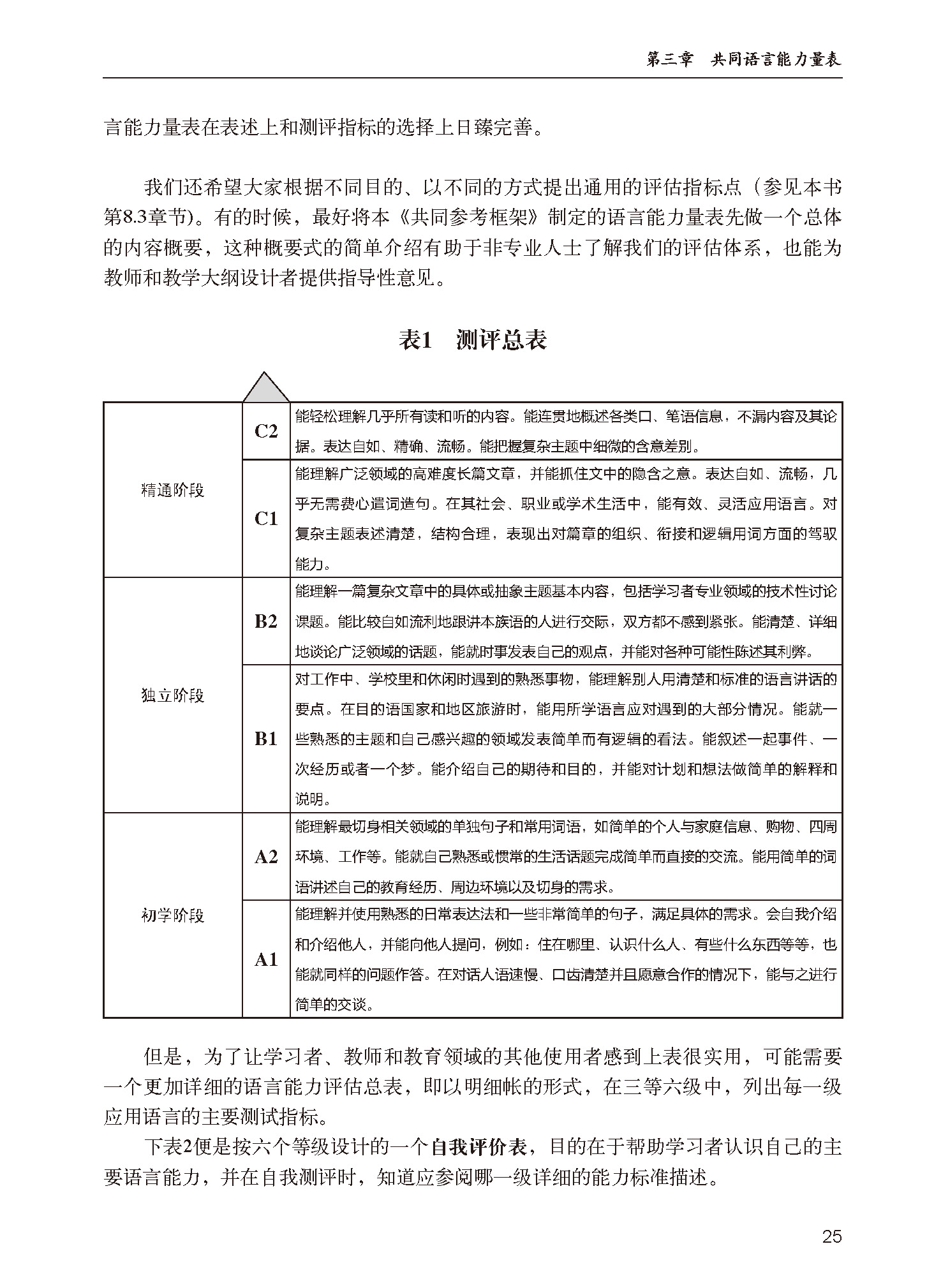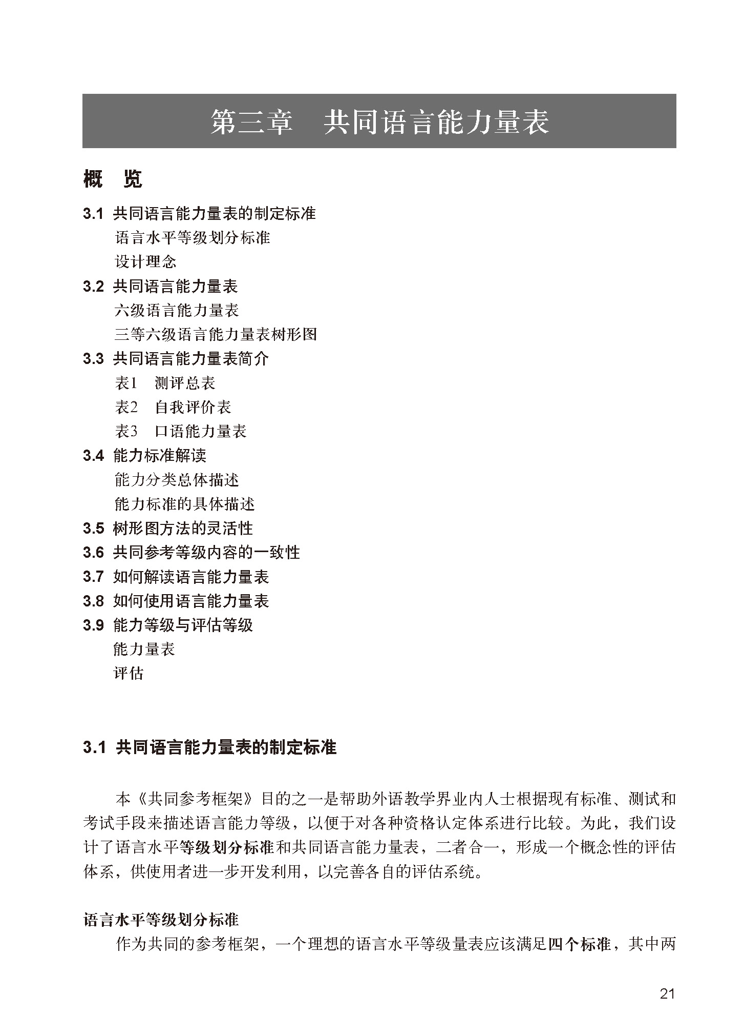 他山之石,可以攻玉。我们在中国国家汉办的指导和支持下,邀请美国亚利桑那大学英语系主任、孔子学院院长刘骏教授以及北京外国语大学法语系主任傅荣教授组织从事语言教育的专家分别从英文本和法文本对《欧洲语言共同参考框架:学习、教学、评估》进行对比翻译并由二位专家对中译稿全文进行了审订。为便于大家学习和研究,译者还编制了《汉法英专业术语对照表》作为《欧洲语言共同参考框架:学习、教学、评估》的附录。希望《欧洲语言共同参考框架:学习、教学、评估》的出版有助于广大从事语言教学和研究的专家更好地了解欧洲语言教学的理念和方法,有助于大家在国际汉语教学实践中学习和借鉴。
