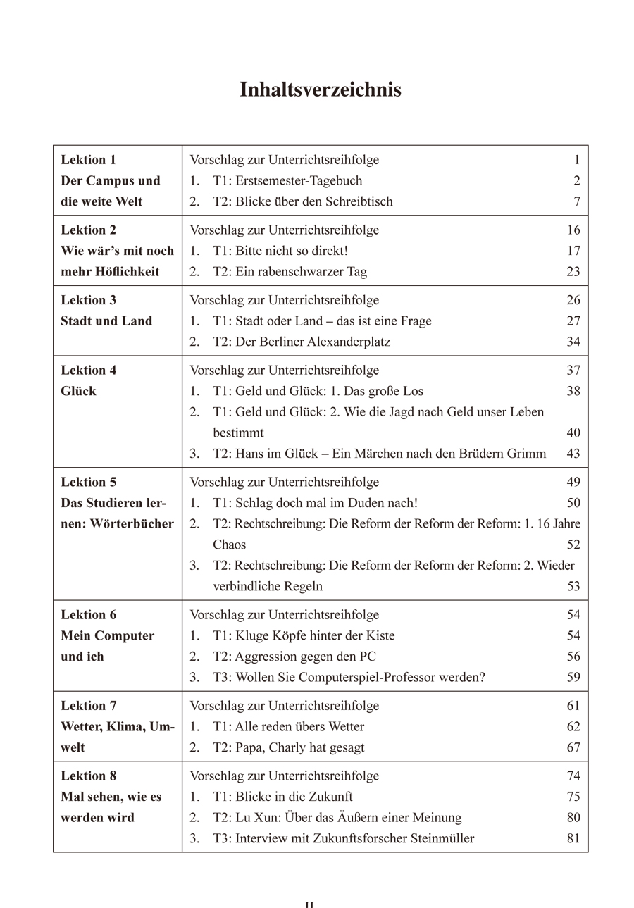 《当代大学德语3教师手册》为高等学校德语专业教材《当代大学德语3学生用书》的配套教师手册。本书主要针对的对象是刚刚参加工作的德语教师,在内容的编写上基本沿袭了《当代大学德语1教师手册》的主导思想,为基础教程每一课的教学程序及具体的教学方法提出建议。始终贯彻联系实际、以学生为中心的启发式教学原则,使学生养成主动参与语言实践的习惯。