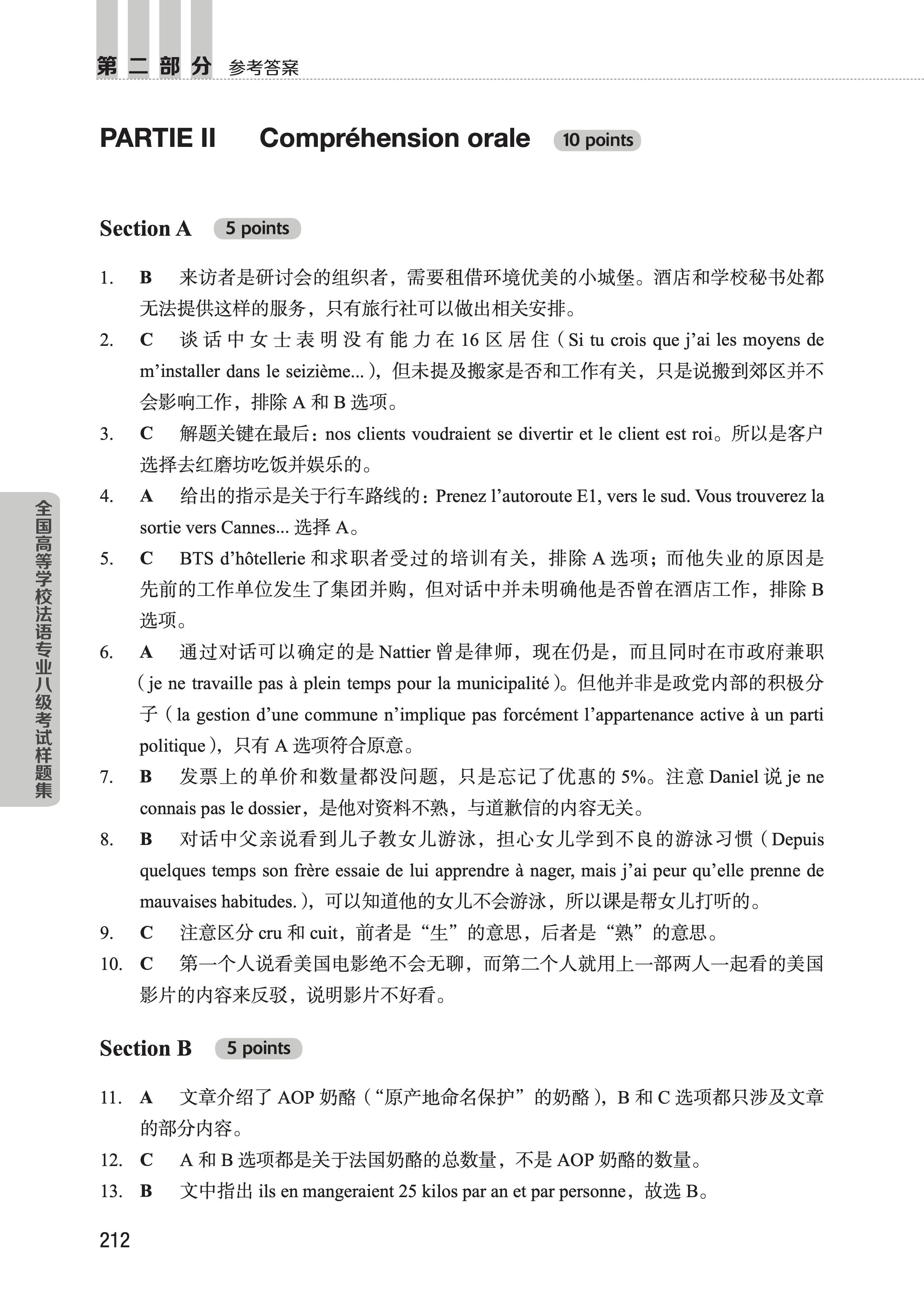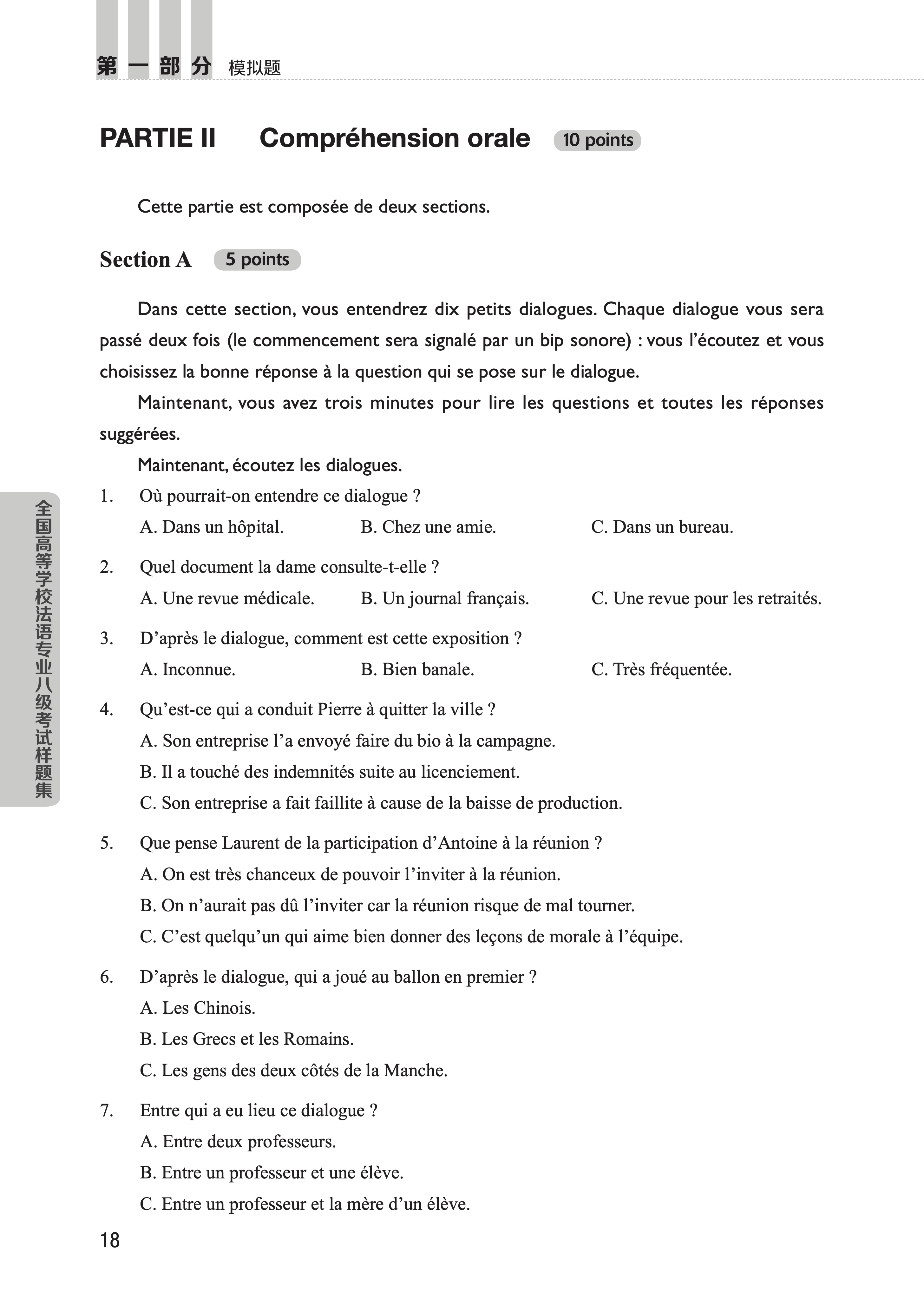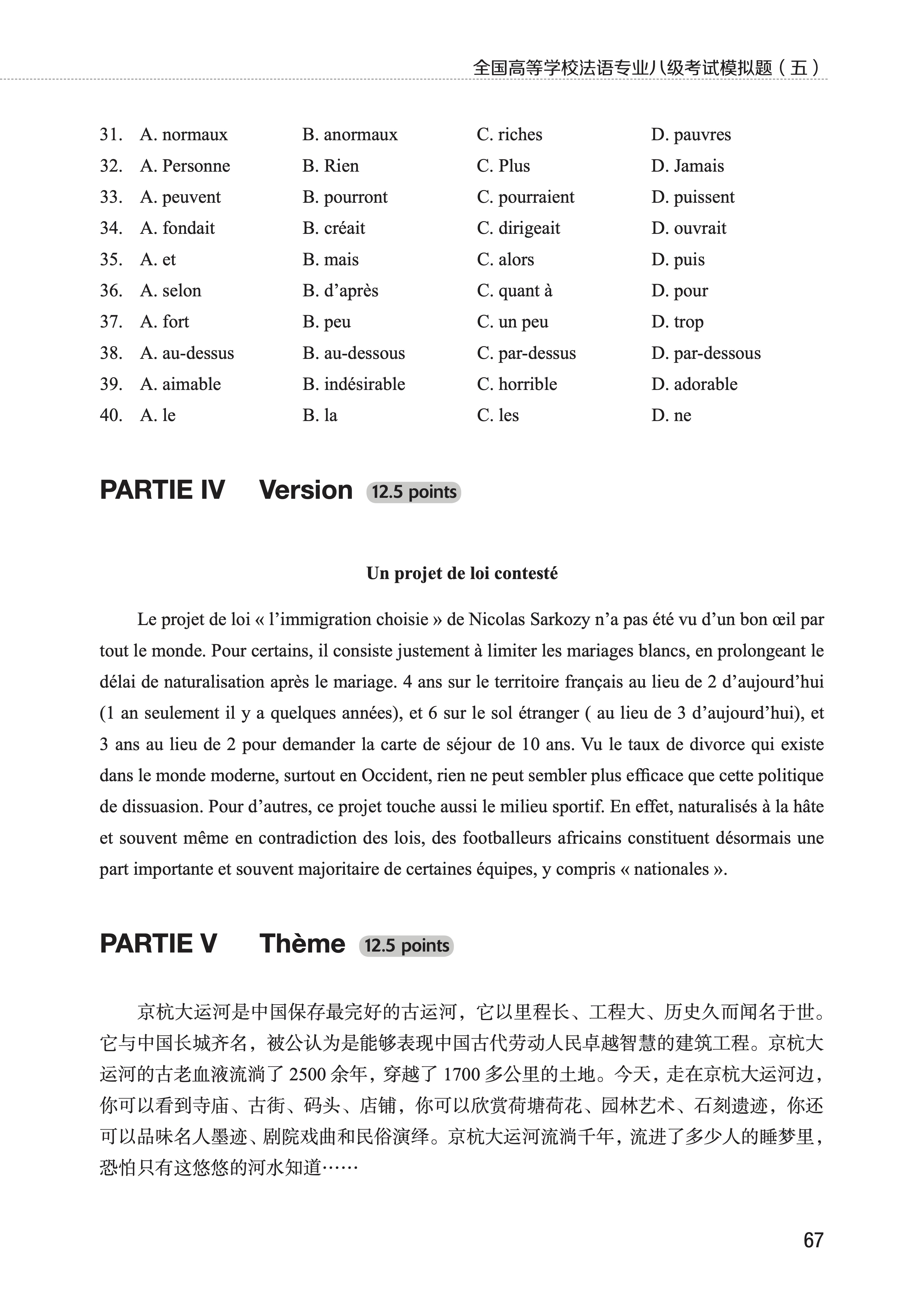 《全国高等学校法语专业八级考试样题集》是专为法语专业本科四年级学生备考"专八"而编写的模拟试题集。全书共包含十套模拟题,题型与法语"专八"考题完全一样,模拟试题的难易程度也非常接近"专八"考试的真题。除参考答案外,还提供详细的答案解析,围绕"专八"的主要考点,帮助考生梳理所学知识,从容应考。