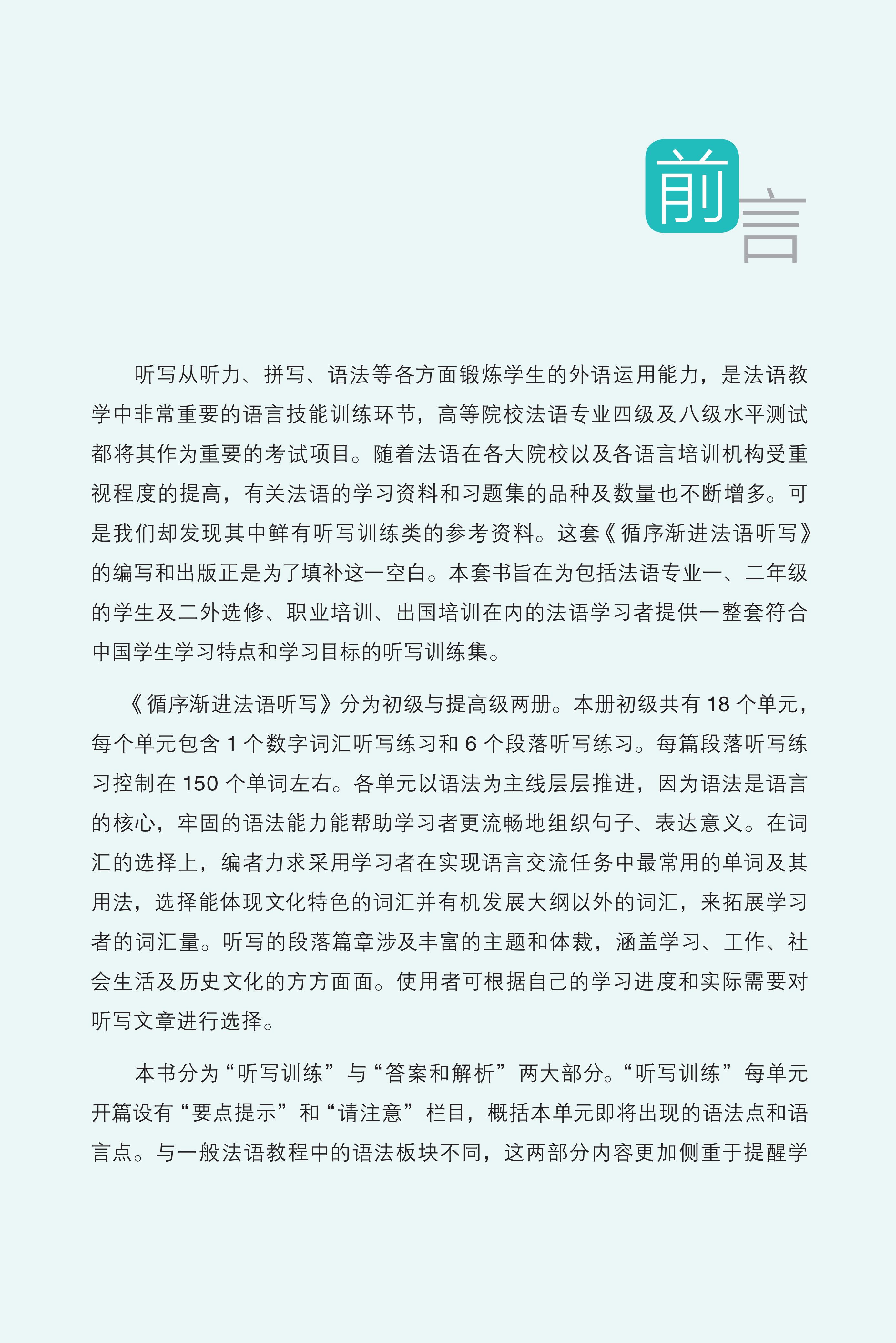 《循序渐进法语听写(初级)》从听力、拼写、语法等各方面锻炼学生的外语运用能力,是法语教学中非常重要的语言技能训练环节,高等院校法语专业四级和八级水平测试都将其作为重要的考试项目。《循序渐进法语听写(初级)》由北外一线教师编写,旨在为包括法语专业低年级学生及二外选修、职业培训、出国培训在内的法语学习者提供一整套符合中国学生学习特点和学习目标的听写训练集。此外,本书配套“外研社法语”APP数字资源,采用一书一码,音频等资源将上线至“外研社法语”APP,方便读者随时学习回顾。
