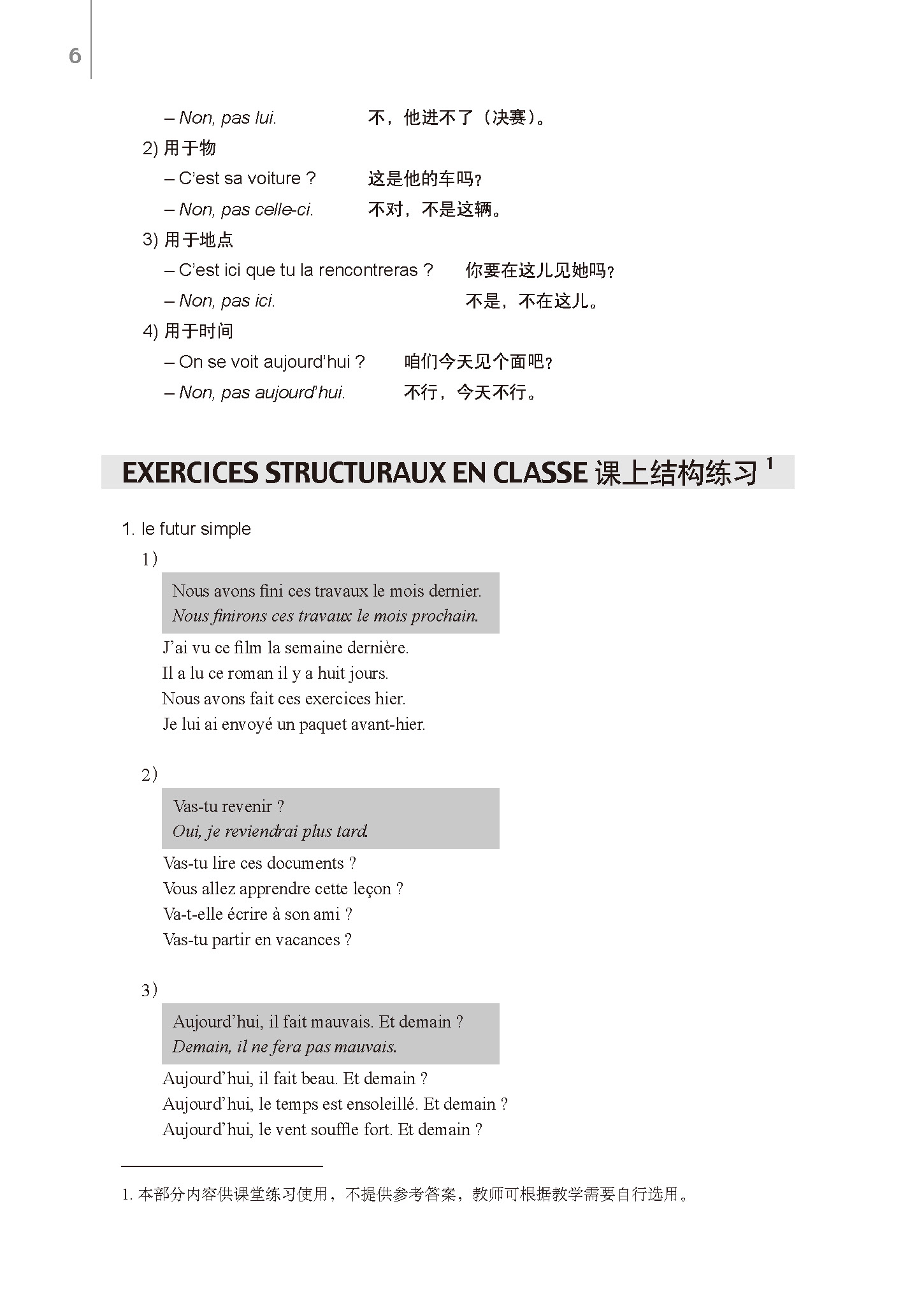 使用《法语(修订本)2》的教师可以根据《法语(修订本)2教学辅导参考书》中的教学目标、词与词组、课上结构练习和本课练习答案等板块组织课堂教学,更可以利用本课测验及答案板块,从中选取练习组织学生进行每课测验。