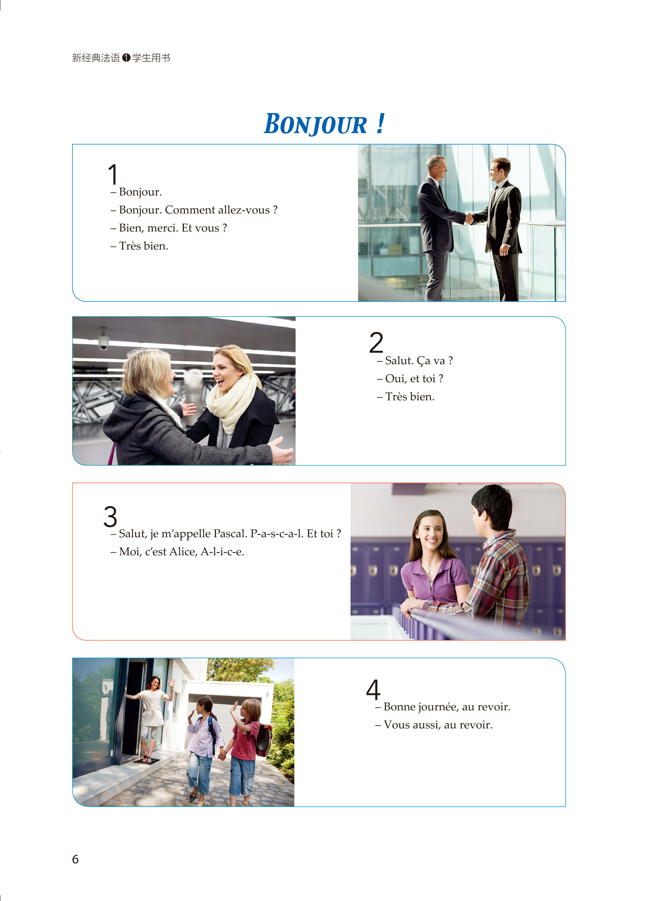 1.交际练习和语言知识讲解并重:《新经典法语》(En route !)兼顾语言基本功训练和交际能力的培养,除了传统的语言知识(语音、词汇、语法等),还特别开辟了"主题词汇"、"交际"和"热身"三大板块,为学生在真实情景中灵活运用语言知识提供实用有效的指导。