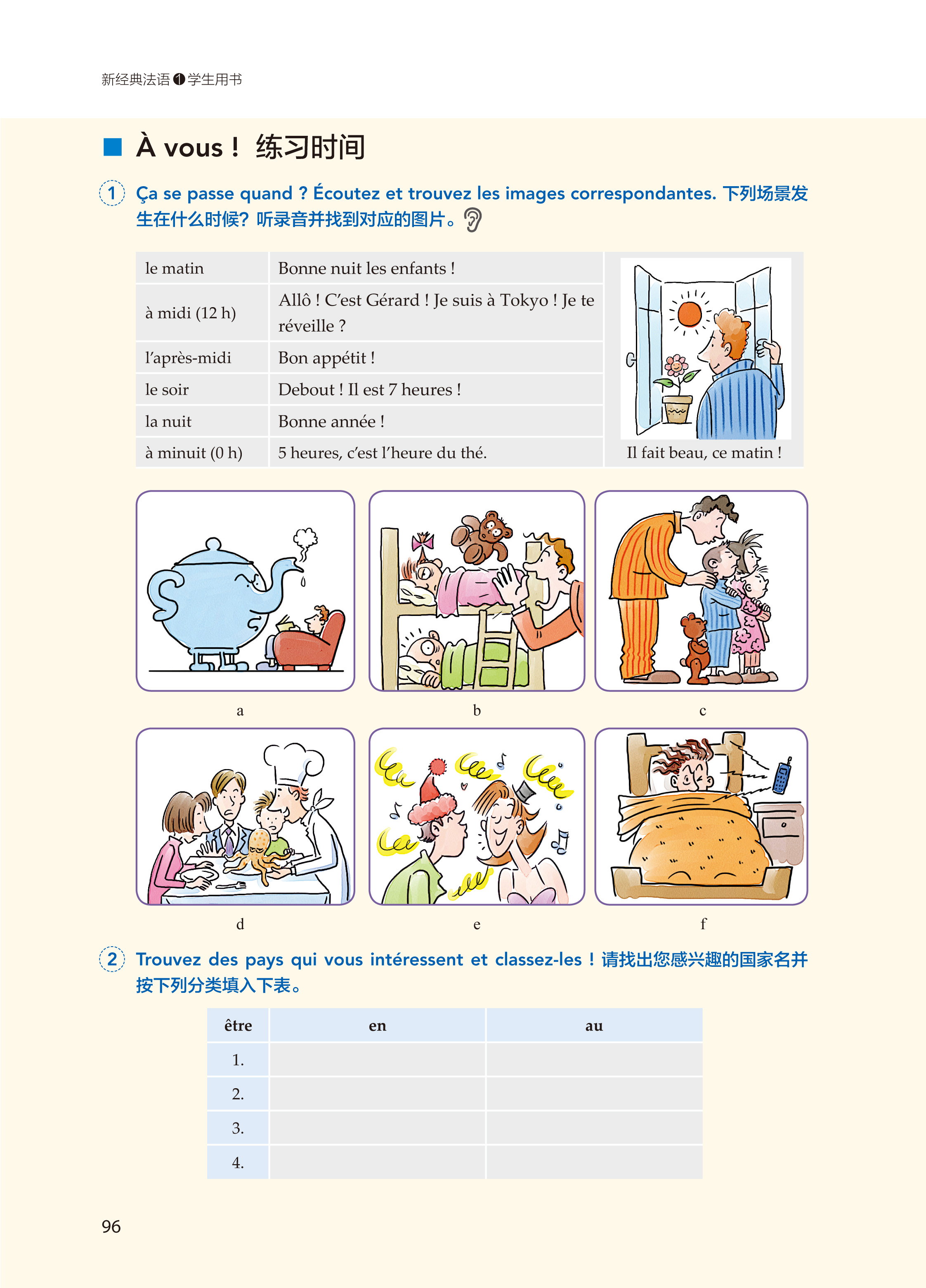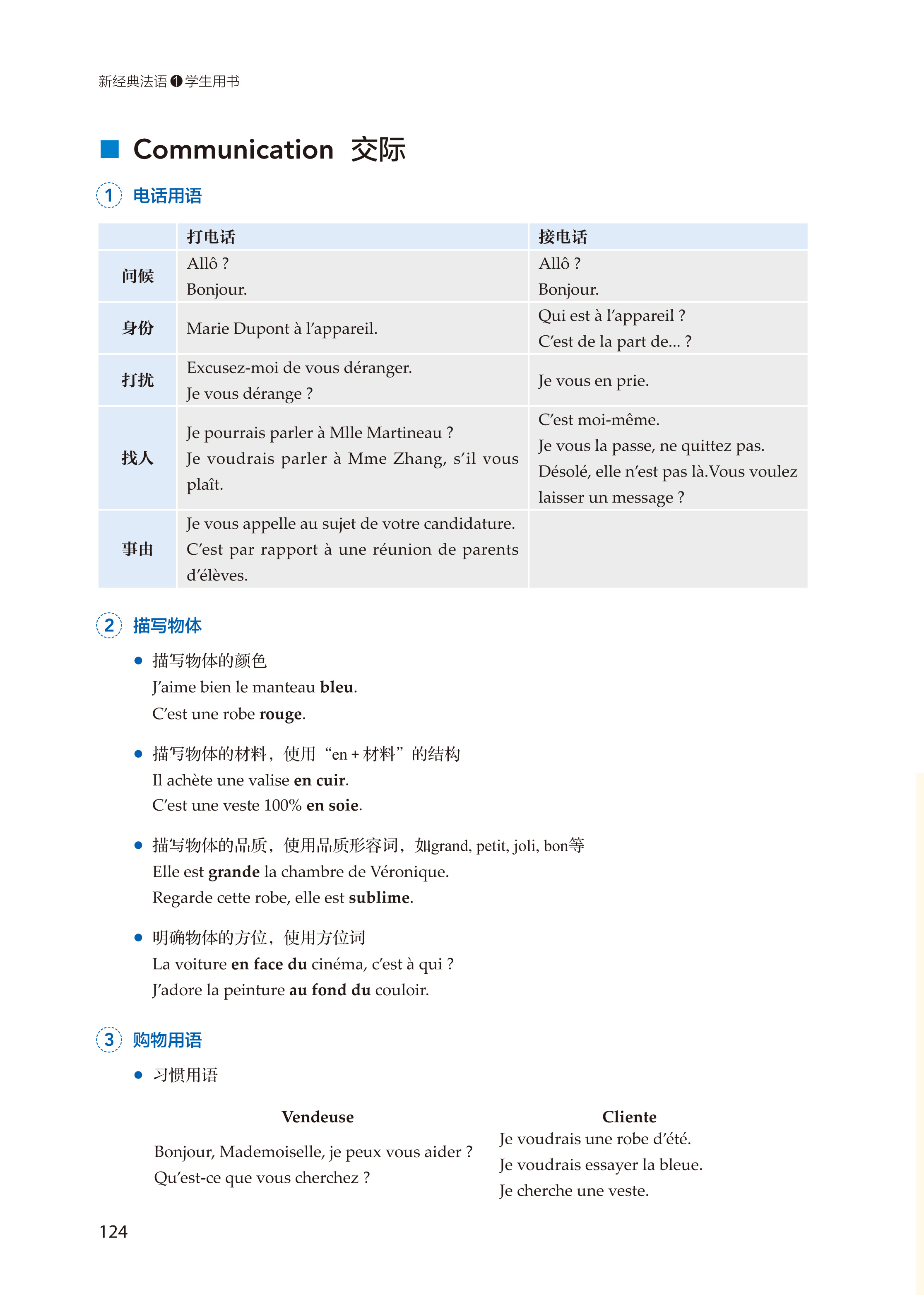1.交际练习和语言知识讲解并重:《新经典法语》(En route !)兼顾语言基本功训练和交际能力的培养,除了传统的语言知识(语音、词汇、语法等),还特别开辟了"主题词汇"、"交际"和"热身"三大板块,为学生在真实情景中灵活运用语言知识提供实用有效的指导。