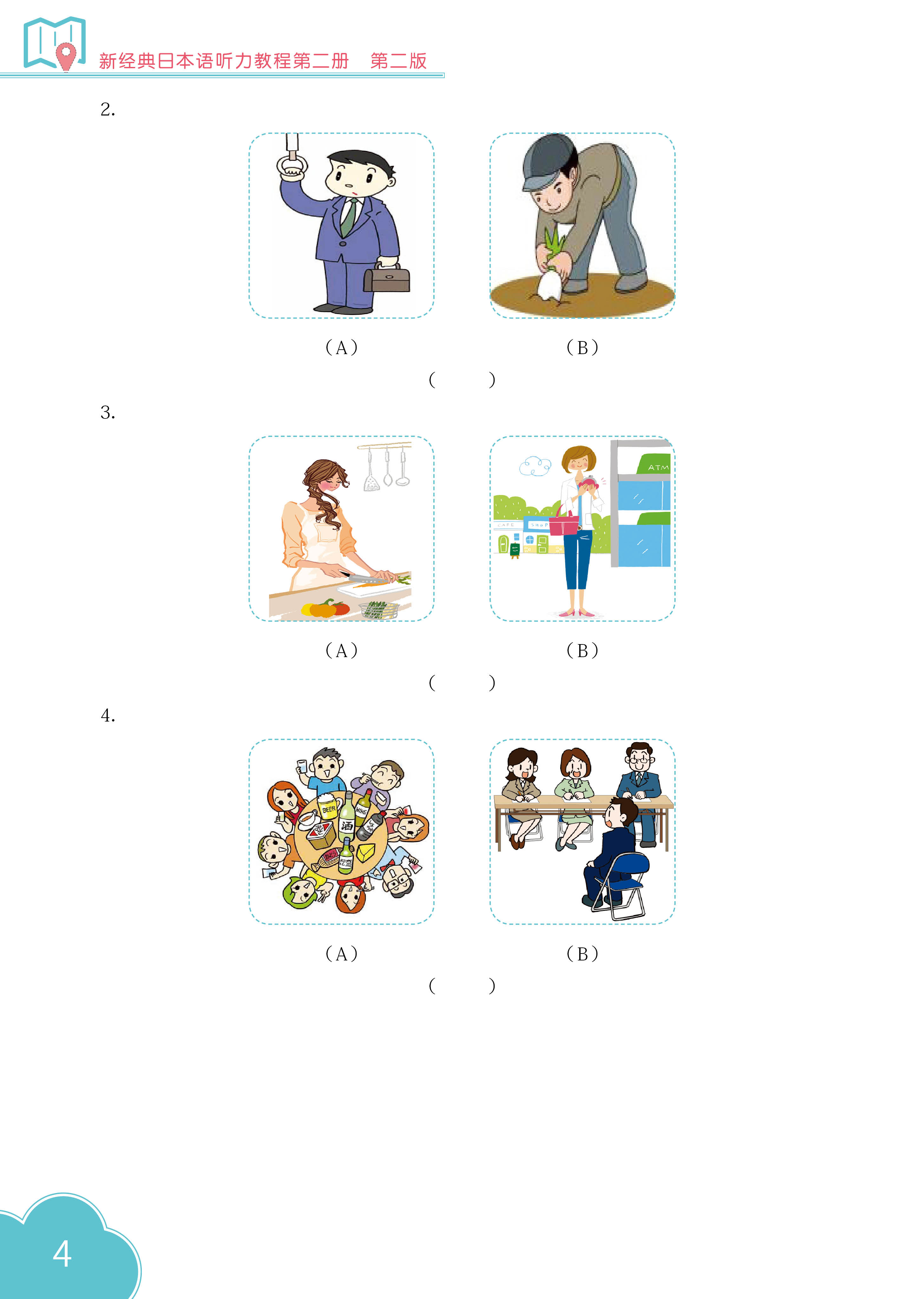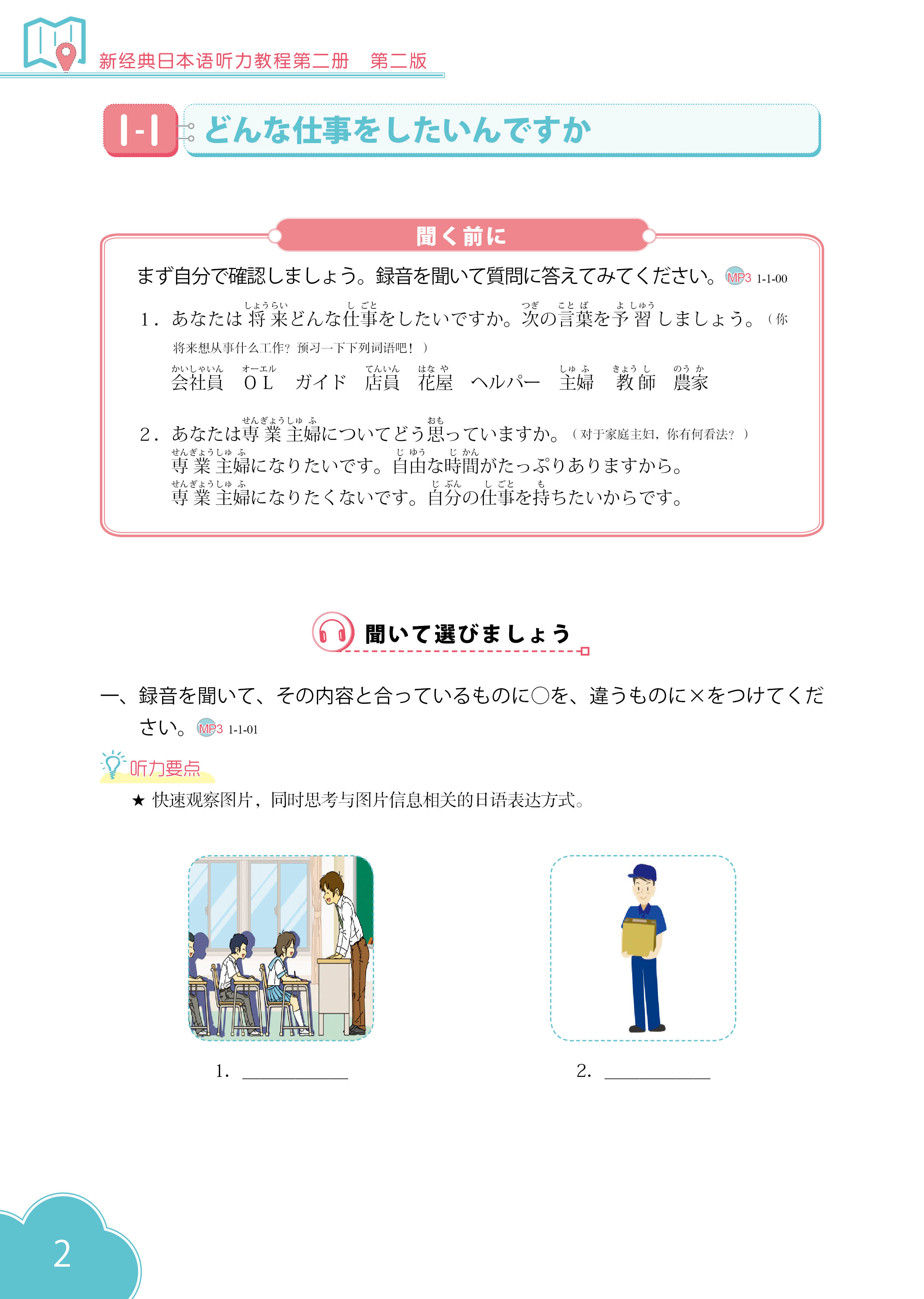《新经典日本语听力教程第二册(第二版)》本套教材分别设计了"听辨""听选""听写""跟读""试说""听译"等环节,强化语言输入与输出的衔接,以"写、说、译"来促进学生听解能力的培养,*终实现提高语言综合运用能力的学习目标。
