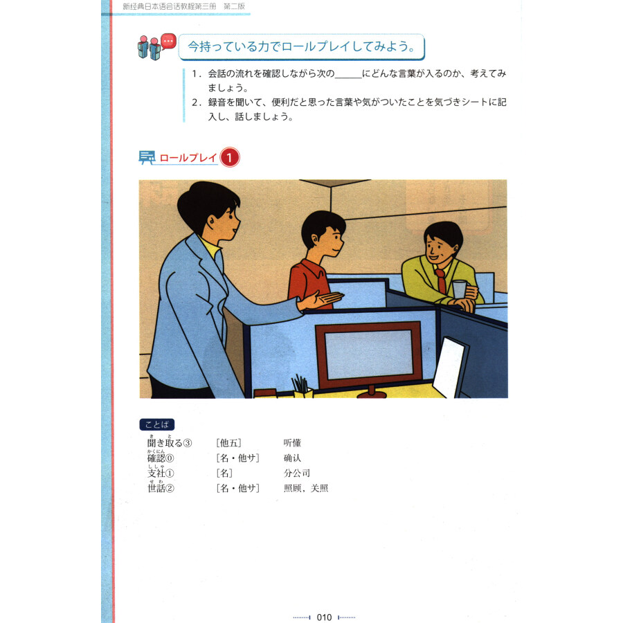 《新经典日本语会话教程第三册(第二版)》为"新经典日本语—会话教程"系列的第3册教材,共15课。本教材在课堂组织中强调学生的全程参与。教师在课堂上无需讲授句型、语法、词汇等语言知识,主要任务是组织、引导学生完成语言运用练习。会话教程的主要任务是完成对学生听说能力的专项训练。完成这一训练较为有效的方法是问答法。该教材通过严格的问答法训练使学生从"分かる"转化到"できる"。 本教材为教师和学习者提供了课堂上使用的课件、课后学生自主训练用的课件练习程序。有助于学生进行自主会话练习,达到将会话练习带出课堂的目的。