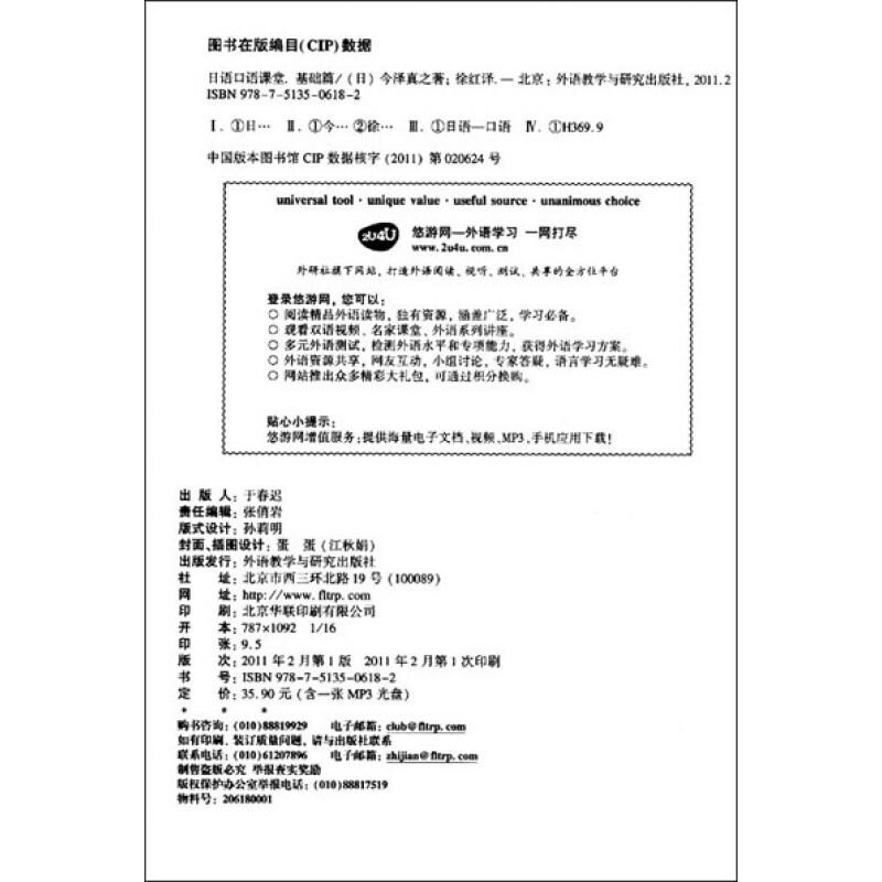“日语口语课堂”系列教材是由《沪江日语》人气博主、新东方日语教师今泽真之根据多年经验编写的。《日语口语课堂 基础篇》包括会话、单词、句型讲解、练习、听力、文化小知识等部分,内容轻松活泼又非常实用。更有著名的蛋蛋老师倾心创作的近700幅插图,还有日本NHK教育频道“唱歌的姐姐”——松原美香小姐倾情录音。外研社全力打造的这套“日语口语课堂”系列教材让您开口说日语再不是件难事!