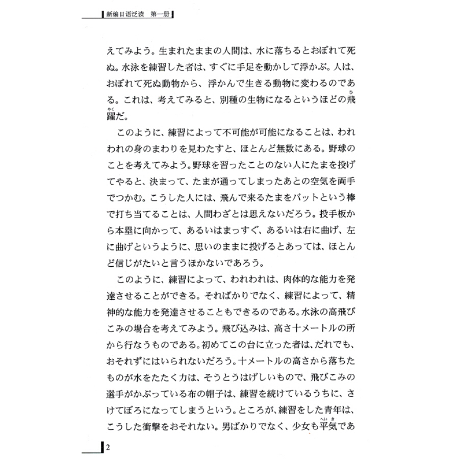 《新编日语泛读》系列教材共四册。第一册分为25课,每课由课文、说明、练习Ⅰ、Ⅱ、Ⅲ、Ⅳ等部分构成。每课选入的文章均系原文,并力避国内其他教材中已出现的文章。文章后配以生僻单词的解释说明。并附练习题进一步巩固对文章的理解。练习的编写以提高学习者的理解能力为原则。“练习I”以词语练习为主,从课文中提出与文章理解密切相关的词语5个左右作为问题,每个问题后设答案若干,以选择的方式进行语义及用方面的练习。“练习II”以内容练习为主,从课文中提出与文章内容的理解密切相关的问题5个左右,结合文章内容在每个问题后设答案若干,供选择练习。“练习III”结合文章的主题思想和中心内容提出问题两个左右,供学生从语篇的角度进行思考、分析和概括。“练习IV”为快速阅读部分,每课选择一篇题材和内容和正文相近的短文为语言材料,并从中提出3个左右的问题以选择的方式供理解练习。书后还附有全部25课的中文译文及练习参考答案。