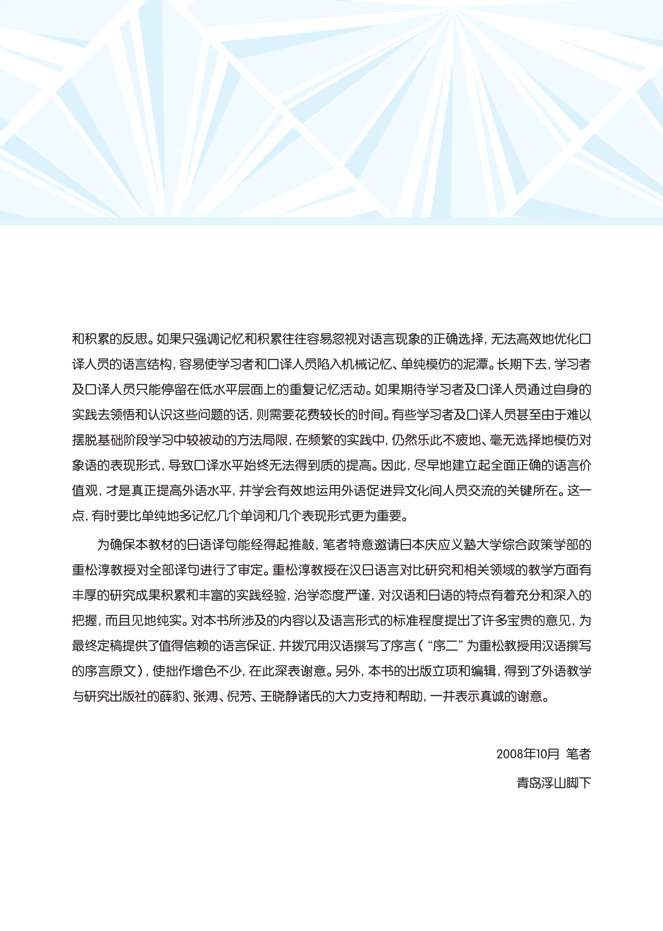 本教材的编写主要针对汉日口译的基础阶段展开,着眼于基础口译教学中语言的规范性,以口译常见场景中的主要语言行为为主线,从千变万化的语言现象中,结合日语文体、词的来源种类(日语称为“語種”)、位相(可以初步理解为词语的用场)、敬语、语感、交际原则等内外部诸多因素,考虑到课堂教学的实效性要求,概括出能满足基本对译需要的相对稳定的表达内容及相应的语言表现形式,并融入笔者自身的实践经验以及相关领域的研究成果,重点归纳介绍一些基本通用的表达形式,同时介绍相关的变化形式,供学习者参考使用。