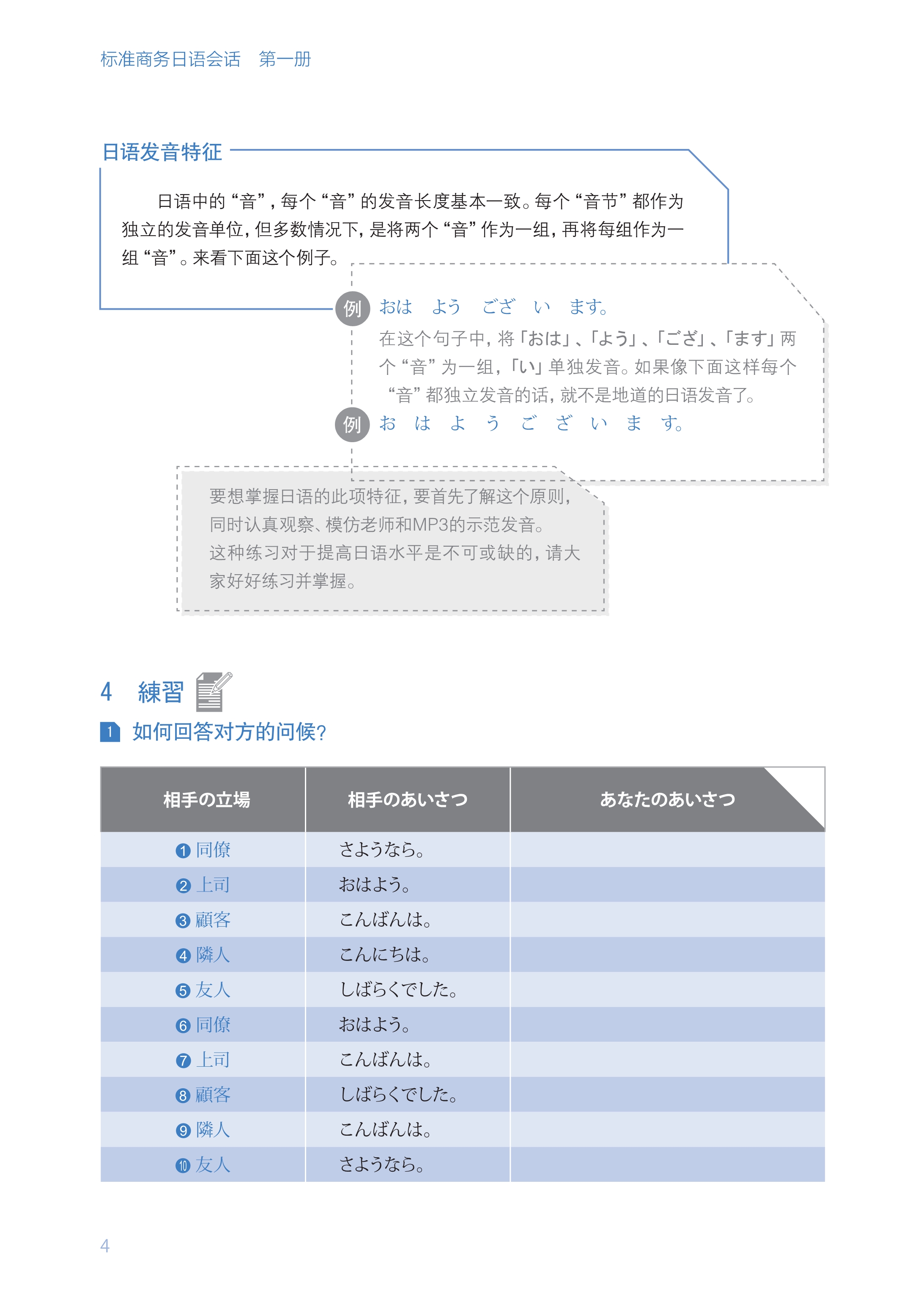 本套教材是针对商务日语专业的学生编写的一套从内容和学习方法上都全新的会话教材。从内容上看,本教材与一般的教材不同,本书从初级阶段开始就引入了与商务相关的专业词汇和企业内部经常使用的商务惯用表达,从学习方法上看,本书打破了以往教材通过机械性的反复练习来死记硬背知识的方法,而是学习者通过已知的知识,根据现有的“假设”在不断的“错误的尝试”中学习语言的方法。