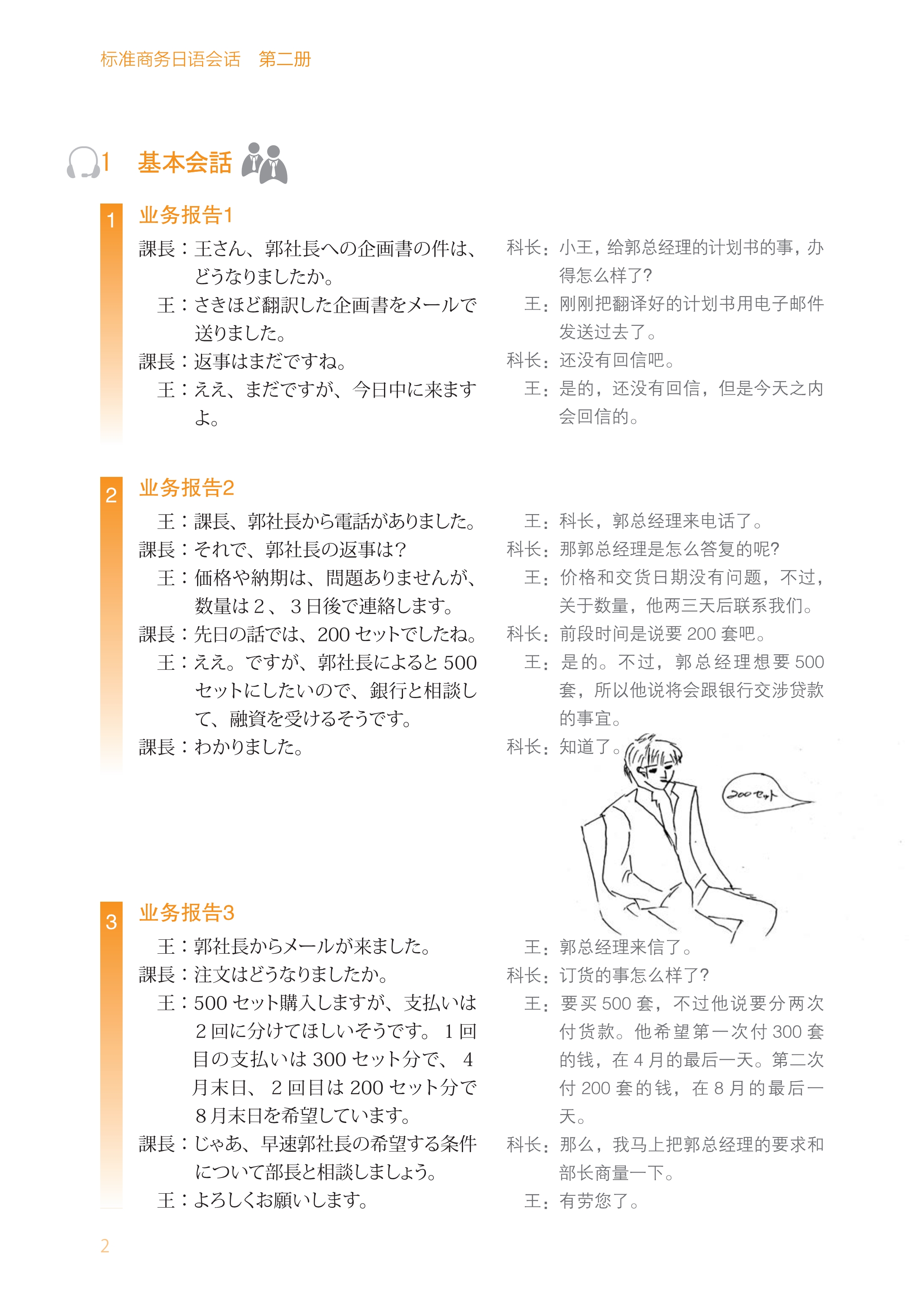 《标准商务日语会话第二册(配光盘)》是针对商务日语专业的学生编写的一套从内容和学习方法上都是全新的会话教材。从内容上看,本教材与一般的教材不同,本书引入了与商务相关的专业词汇和企业内部经常使用的商务惯用表达方式;从学习方法上看,本书打破了以往教材通过机械性的反复练习来死记硬背知识的方法,而是学习者通过已知的知识,根据现有的“假设”在不断的“错误的尝试”中学习语言的方法。