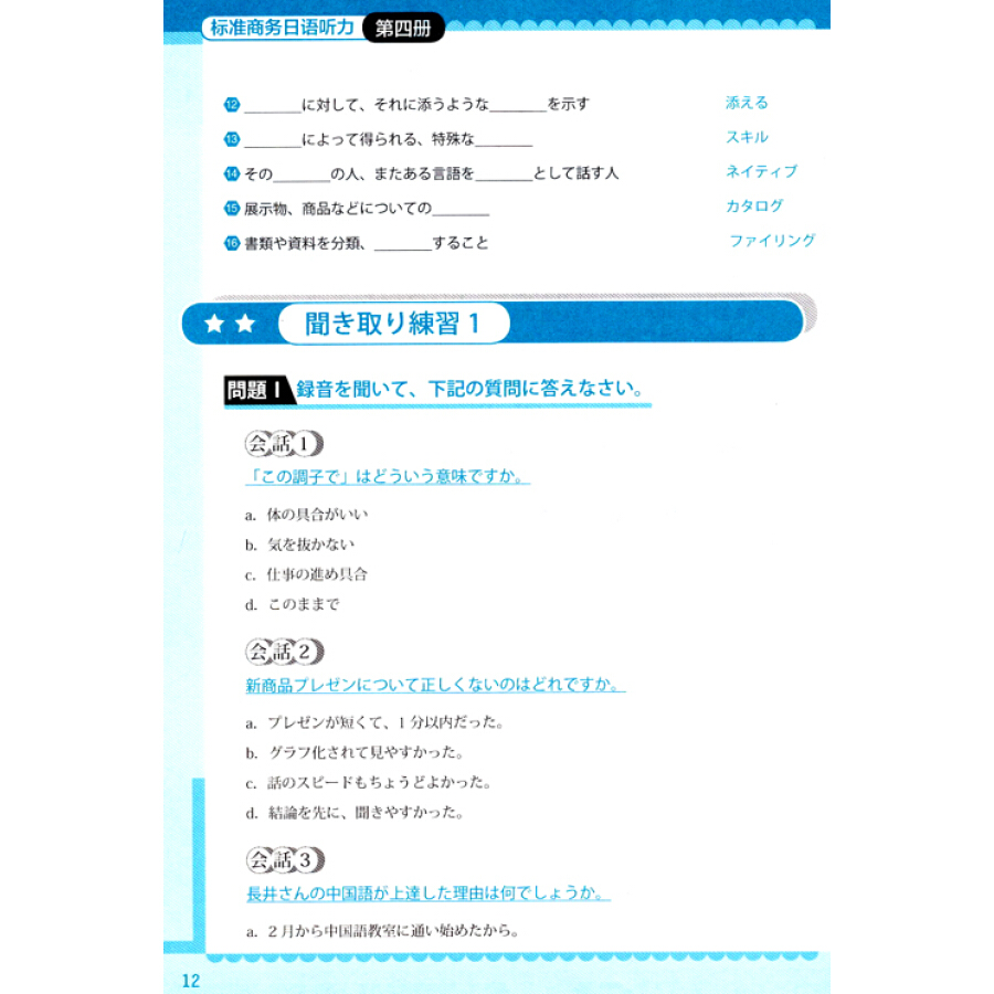 《标准商务日语听力第四册》与《商务日语基础日语第四册》横向接轨。本教材题型新颖,图文并茂,结构紧凑,内容上连贯性好,能充分引起学习者的兴趣。值得一提的是,本教材改变了以往教材内容枯燥,“以背代听”的弊端,注重培养实力,让学生能活学活用,可以说进行了一次极富挑战性的改革。每单元设有综合练习,帮助读者顺利通过J.TEST、标准商务日语考试等商务日语考试。