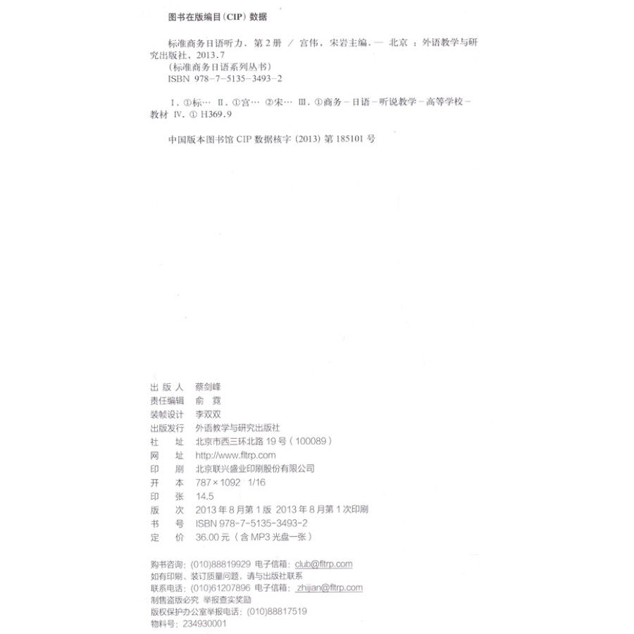 《标准商务日语听力第二册》为《标准商务日语系列丛书》的第二册,针对大学商务日语专业二年级学生,以及社会上的商务日语初级至中级学习者编写。根据各教学环节的需要,很好地与《标准商务基础日语第二册》横向接轨。《标准商务日语听力第二册》共有十六课,涵盖面广,针对性强。每四课配有一个综合练习。