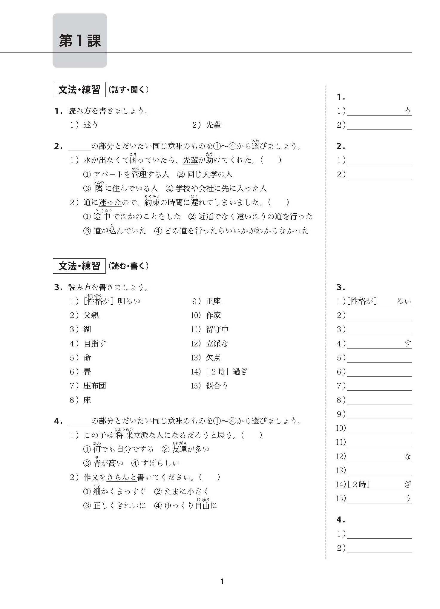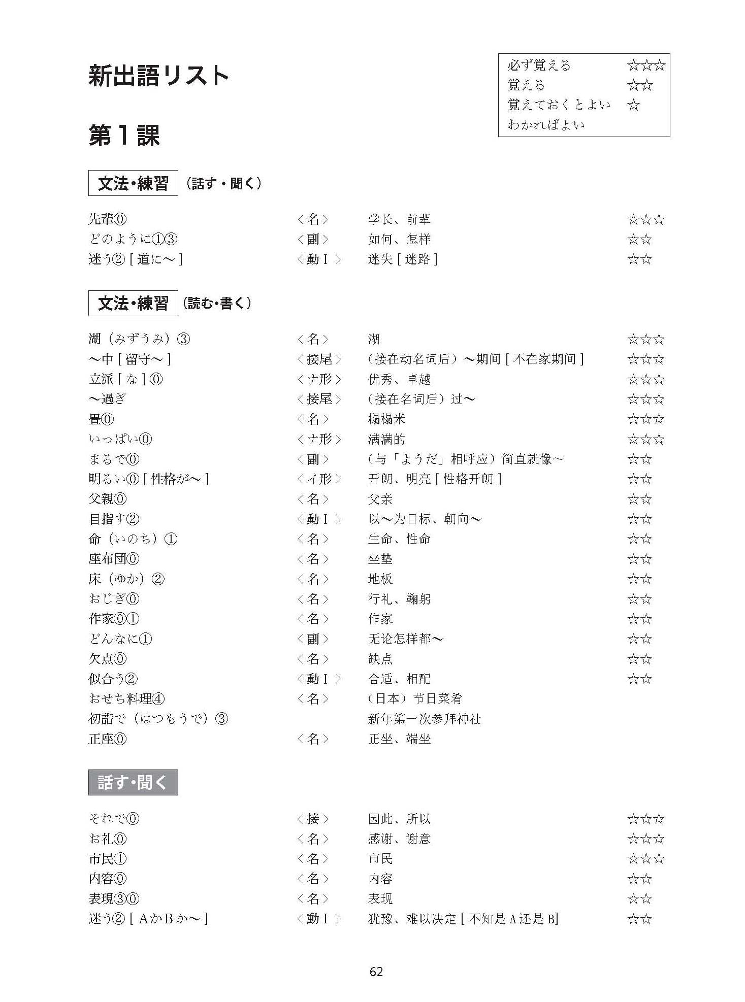 1. 每课共计4页问题,由“语法、练习 < 说、听 >”→“语法、练习 < 读、写 >”→“说、听”→“读、写”构成。每3课设置一个复习,*后设有总复习。每课的问题,可以用于单词的预习和复习。