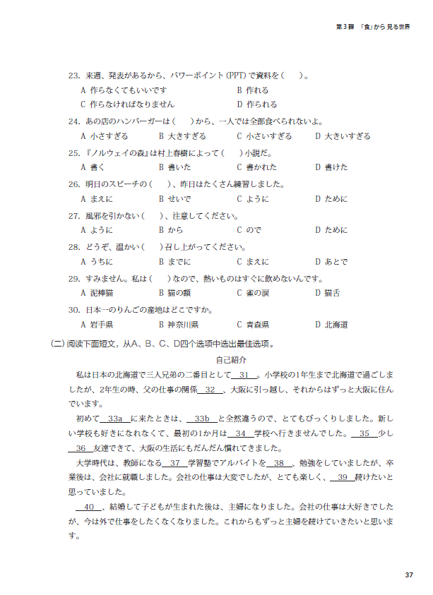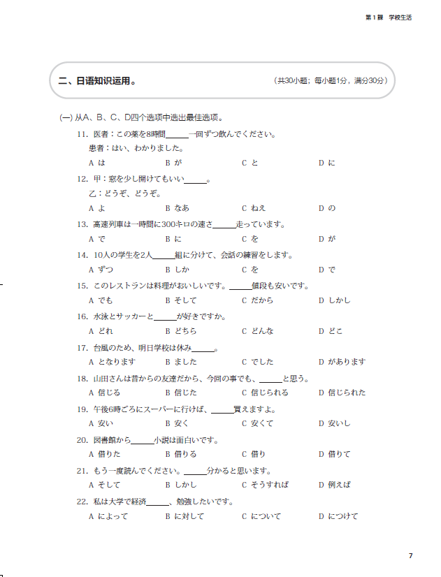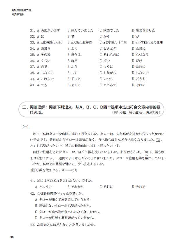 《新起点日语第二册同步练习册》依据《普通高中日语课程标准(2017年版)》提出的育人目标和具体要求编写而成,与《新起点日语第二册》教材配套使用。练习册与教材互为补充、相辅相成,为教学提供听、说、读、写等方面的训练材料,培养学生日语综合运用能力,使学生在语言能力、文化意识、思维品质、学习能力等方面得到均衡的发展。按照课次编排,共有12课的基础训练和同步测试,另外还有三套单元测试卷。