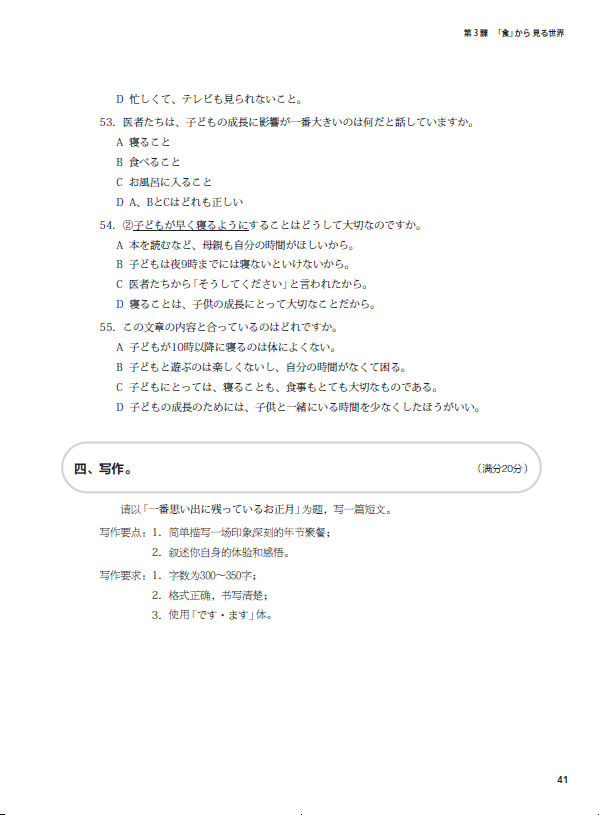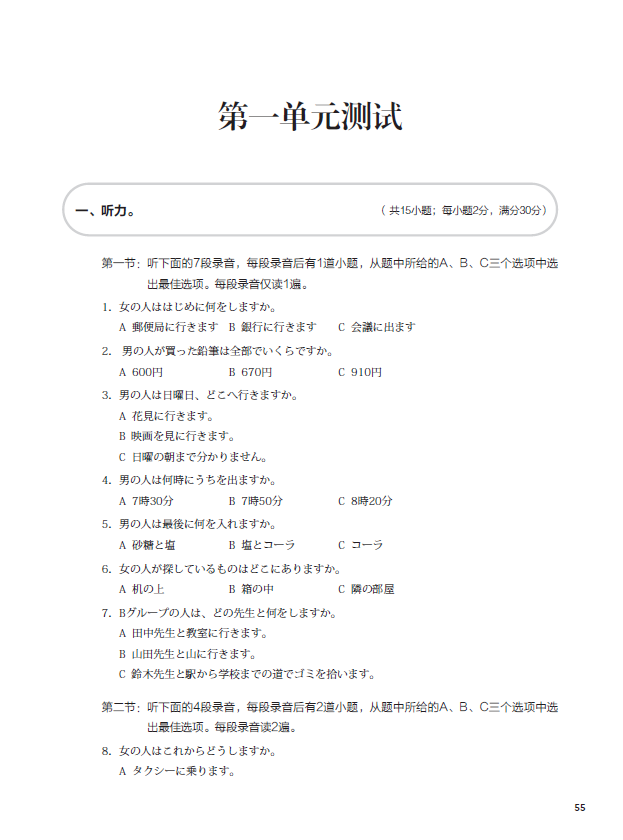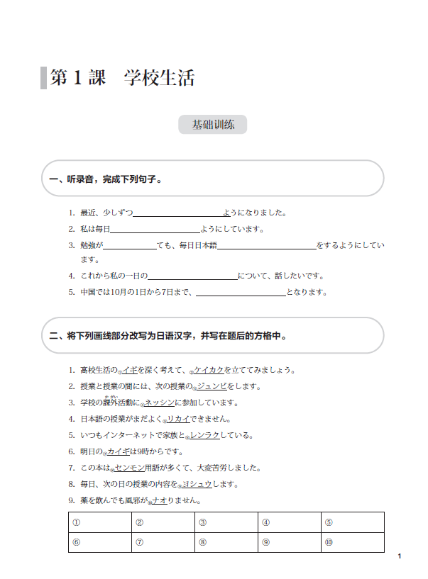 《新起点日语第二册同步练习册》依据《普通高中日语课程标准(2017年版)》提出的育人目标和具体要求编写而成,与《新起点日语第二册》教材配套使用。练习册与教材互为补充、相辅相成,为教学提供听、说、读、写等方面的训练材料,培养学生日语综合运用能力,使学生在语言能力、文化意识、思维品质、学习能力等方面得到均衡的发展。按照课次编排,共有12课的基础训练和同步测试,另外还有三套单元测试卷。