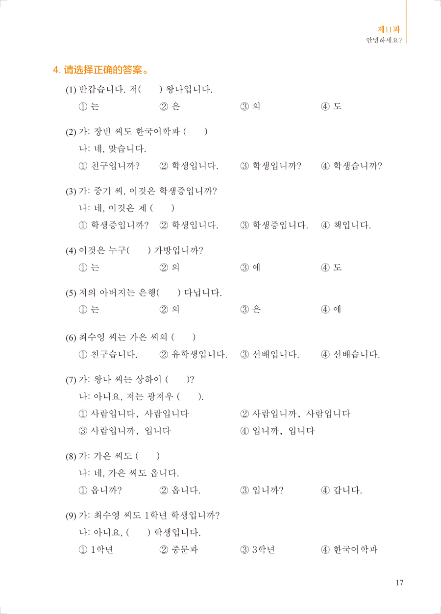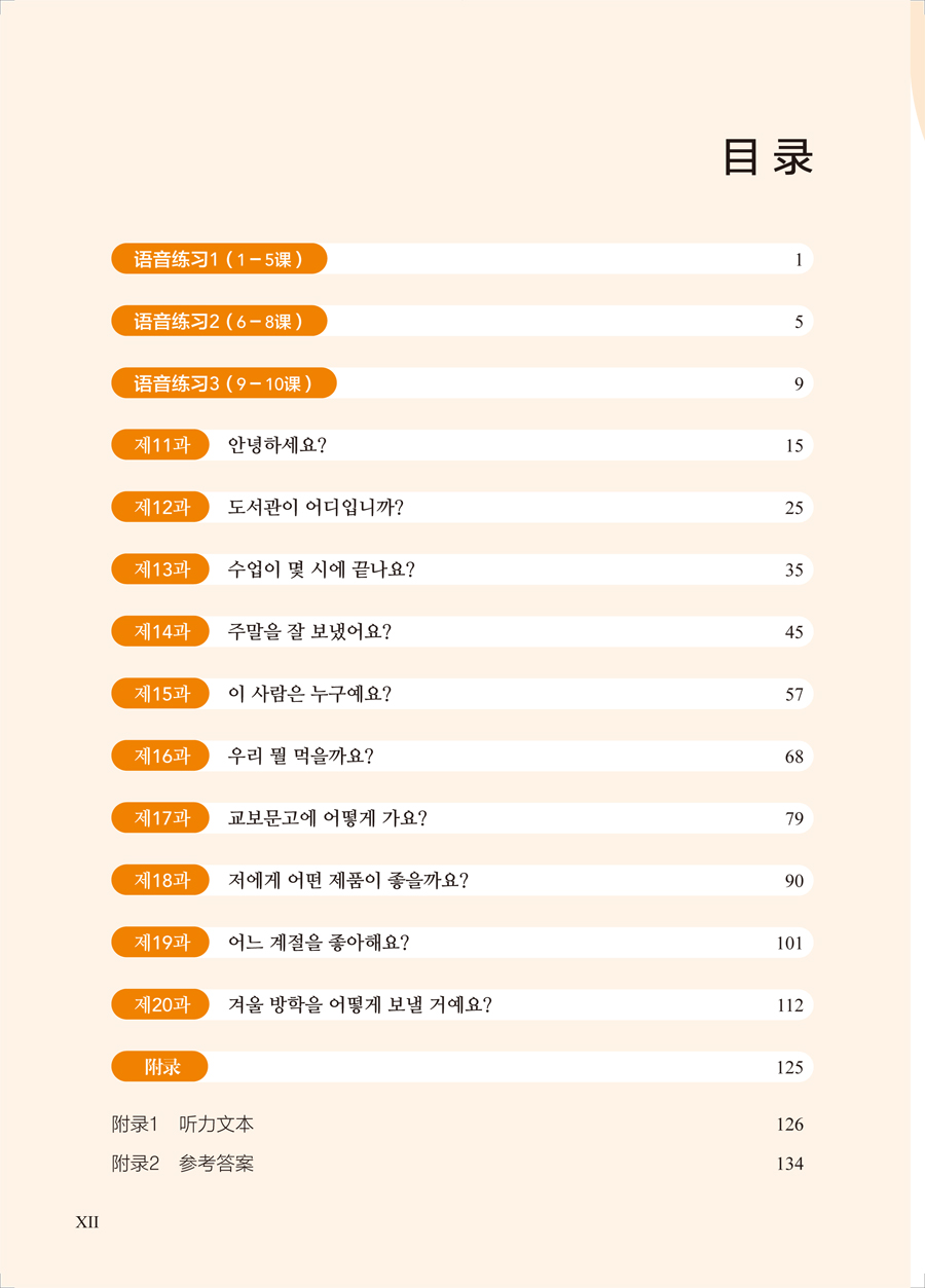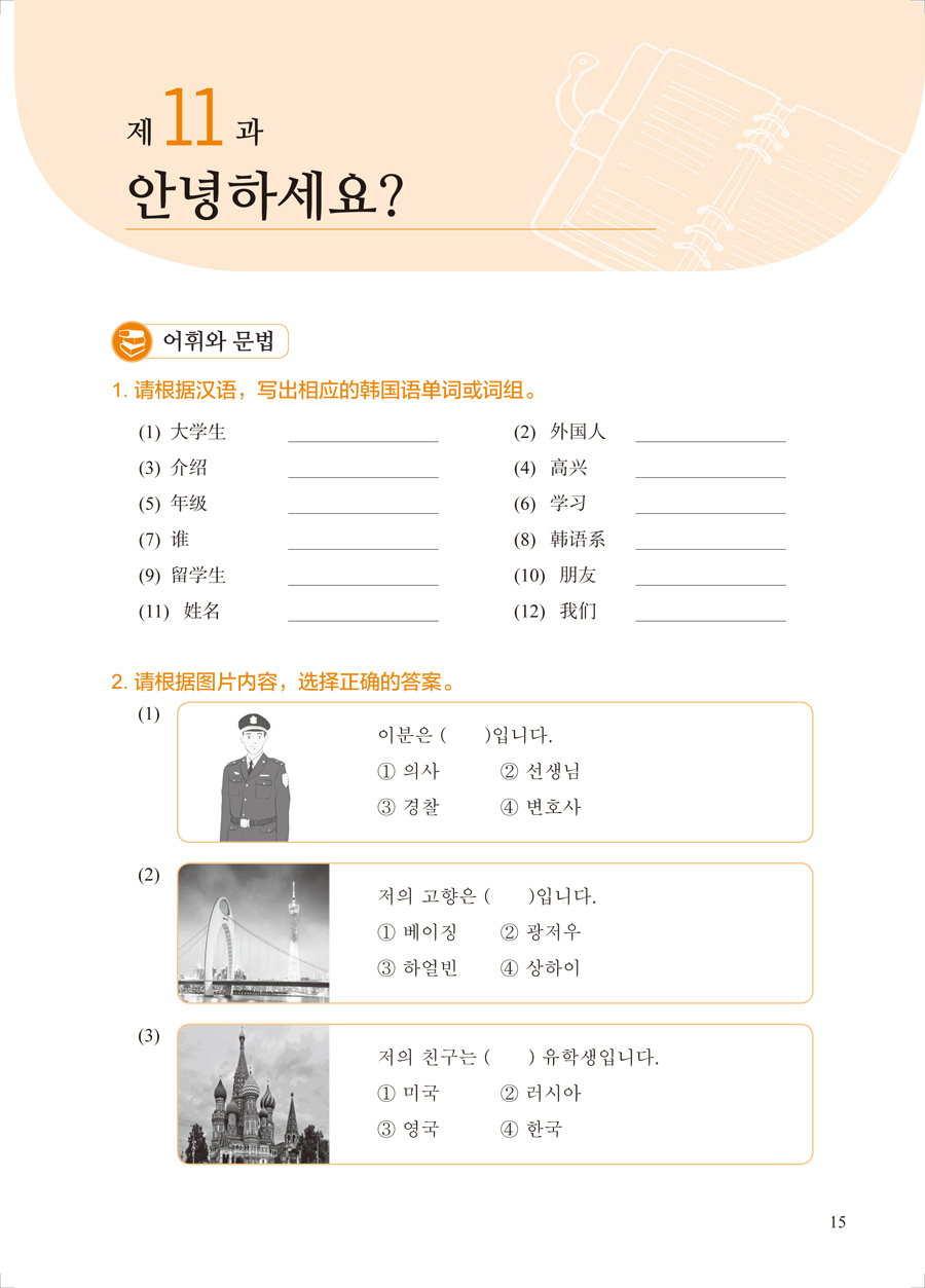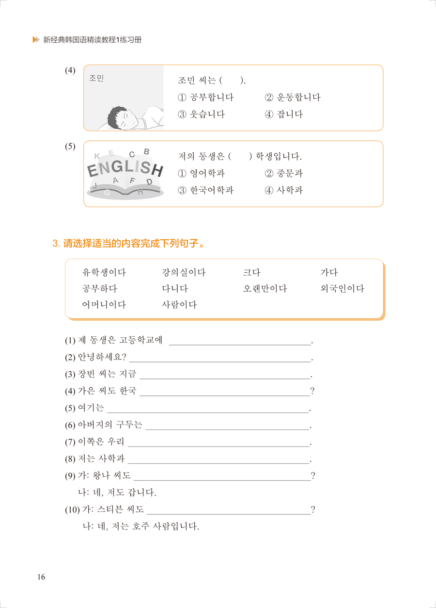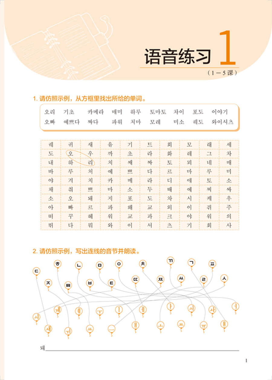 《新经典韩国语精读教程1 练习册》是对主教材内容的复习和巩固,也是延伸和拓展。学生通过练习可以实现自我评价,及时掌握自己的学习情况,从而提高自主学习能力。在练习册编写过程中,我们借鉴了国内外诸多朝鲜(韩国)语及其他语种教材的配套练习册,力求编写符合主教材的人才培养目标、适合国内学生使用的精读教程配套练习册,满足广大朝鲜(韩国)语学习者的需求。但受编写时间和水平所限,难免有疏漏不足之处,诚挚希望朝鲜(韩国)语教育界同仁及学生提出宝贵的意见与建议。