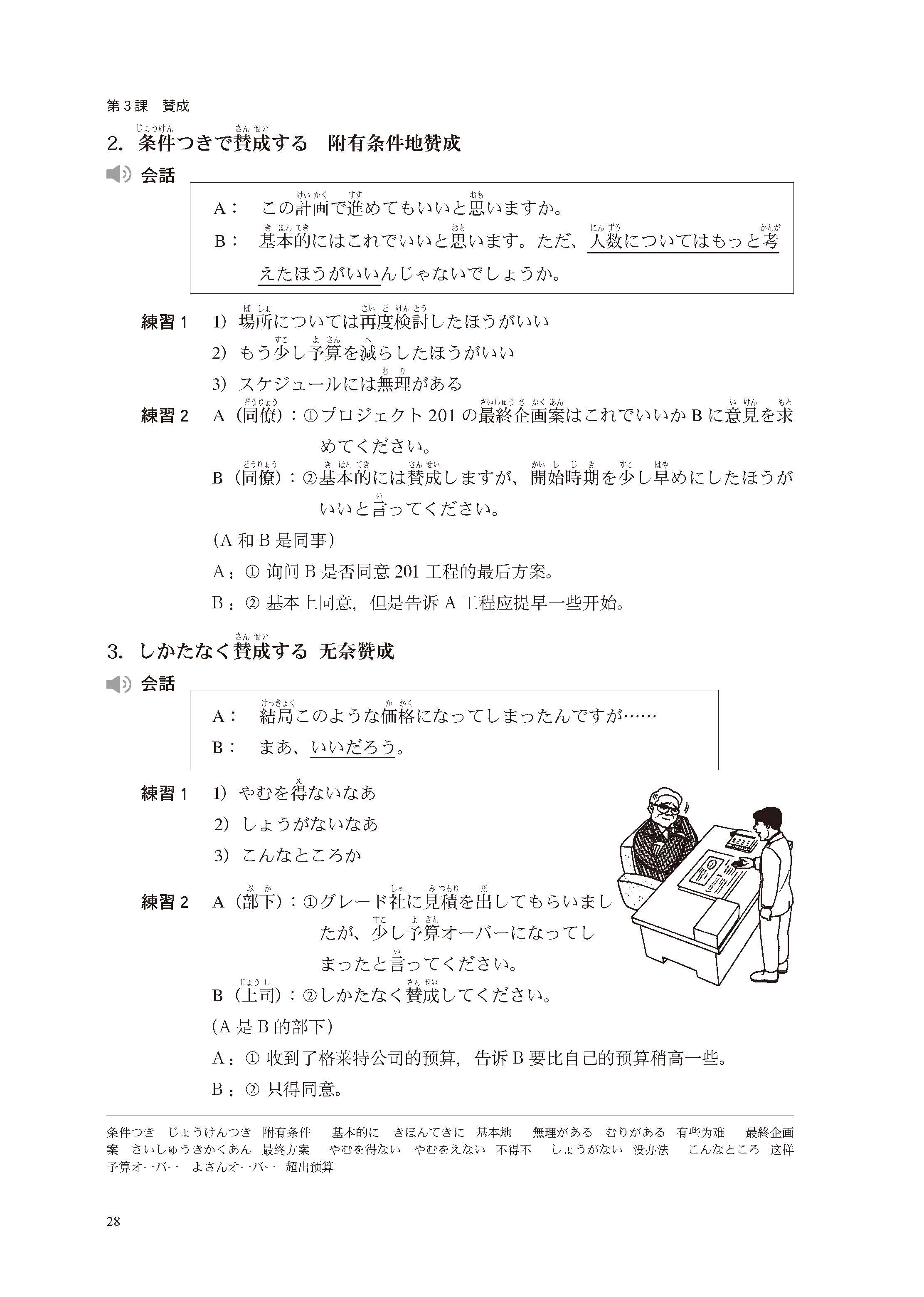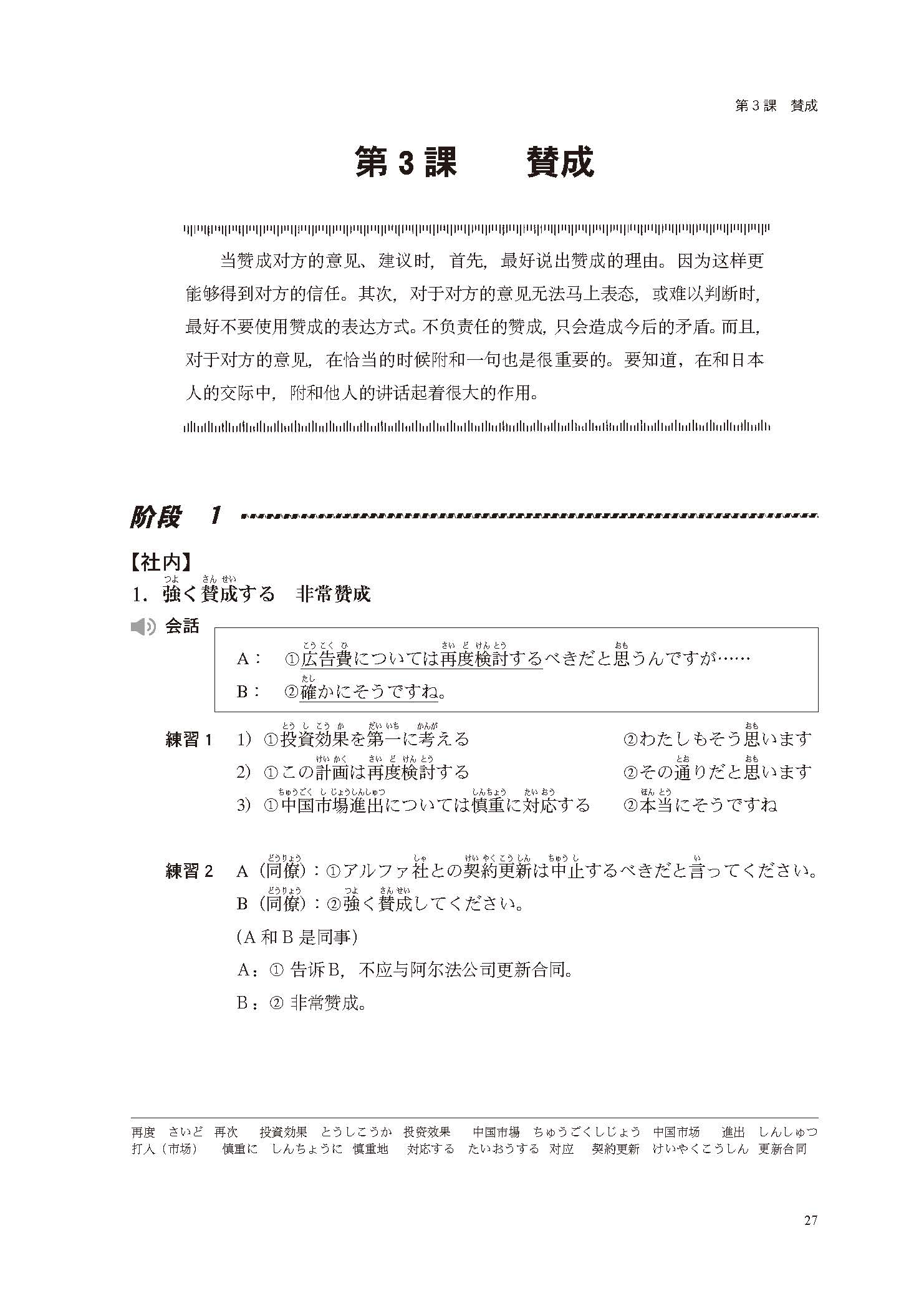 《商务谈判日语(新版)》是我社由日本3A出版社引进的,希望能有助于学习者掌握商务日语独有的运用规则。本书由两部分组成,即主教材和所附的学习指南。主教材以商务活动中经常出现的主要活动内容为主题,围绕这个主题分4个阶段展开讲解和练习。每个阶段中还分为【社内】【社外】两部分,在讲解和练习中充分体现出对公司内部同事和公司外部人员在言谈举止及表达方式上的不同。学习指南包括因场景不同而使用的不同表达方式的总结、注意事项的讲解、练习答案、针对教师的教学指导、商务日语活动中经常使用的关键语句及每课书后针对日本公司商务礼仪介绍部分的译文。考虑到中级学习者的日语水平,在这本中级水平的《商务谈判日语》中,我们适当地对日文会话及其他某些部分进行了中文解释,以帮助学习者加深理解。此外,还将每课书后针对日本公司商务礼仪介绍部分的译文收录在本书所附的学习指南分册中每课的答案之后,以供读者参考。