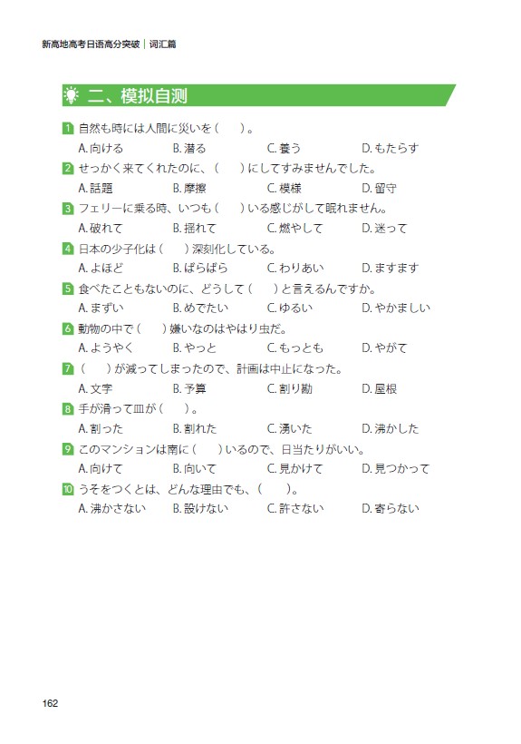● “第二阶段:巩固提升”的“模拟自测”包含高考日语真题和模拟题。
