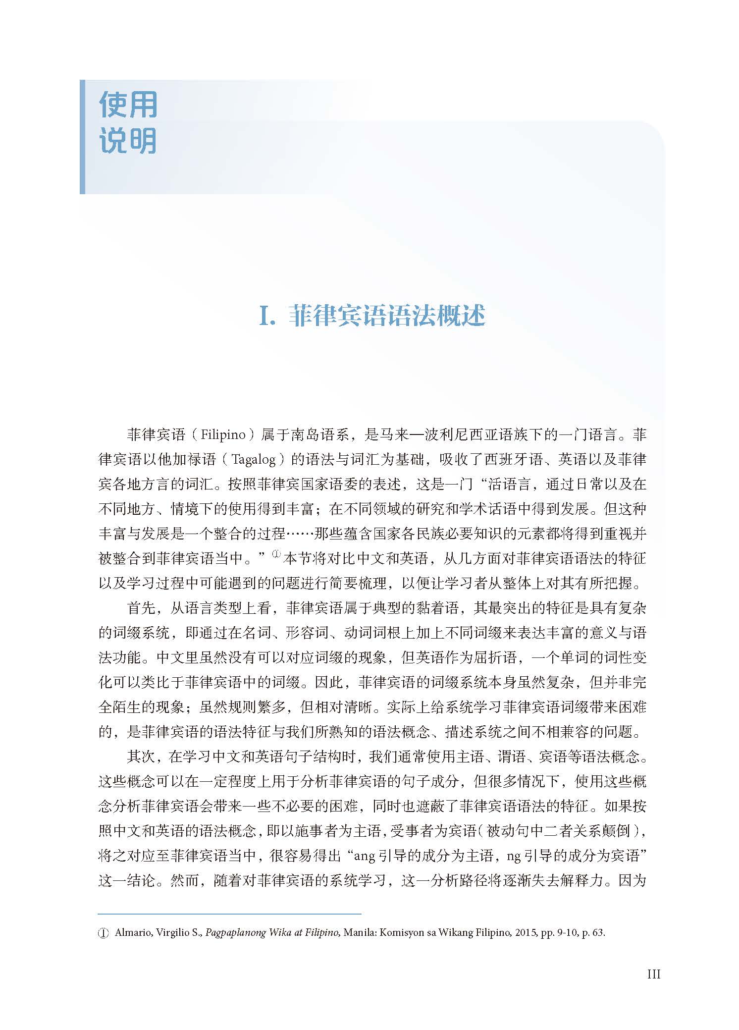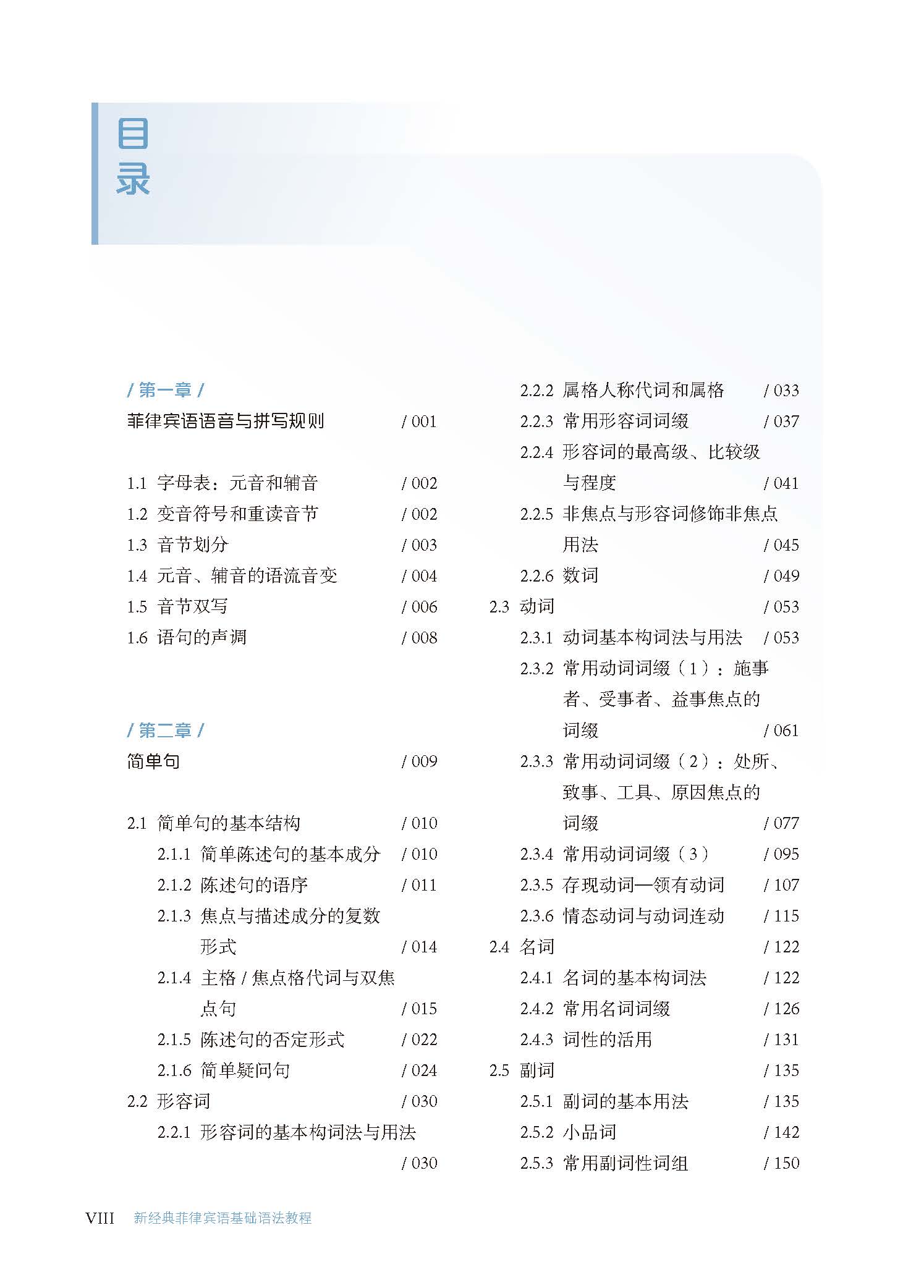 《新经典菲律宾语基础语法教程》主要针对高等教育菲律宾语专业大二年级及以上学生编写,要求学习该书前学生至少能够熟练掌握北京大学出版的《基础菲律宾语1》中的内容。本书并非一本从零开始的语法手册,而是旨在系统、集中地解决语言教学实践当中出现的语法问题。因此,要求学习或使用该书的学生具备一定的菲律宾语语言技能和菲律宾语自学能力。本书在章节编排上按照由简入繁的顺序:在句子结构上,先讨论简单句和复合句,其次是由简单句构成的复杂句;在词类上,按照不同词性,从基本构词法和用法入手,再到较为复杂的词汇和特殊用法。这一安排基本符合语言学习的一般规律,特别是语言习得实践中语法概念的生成过程。