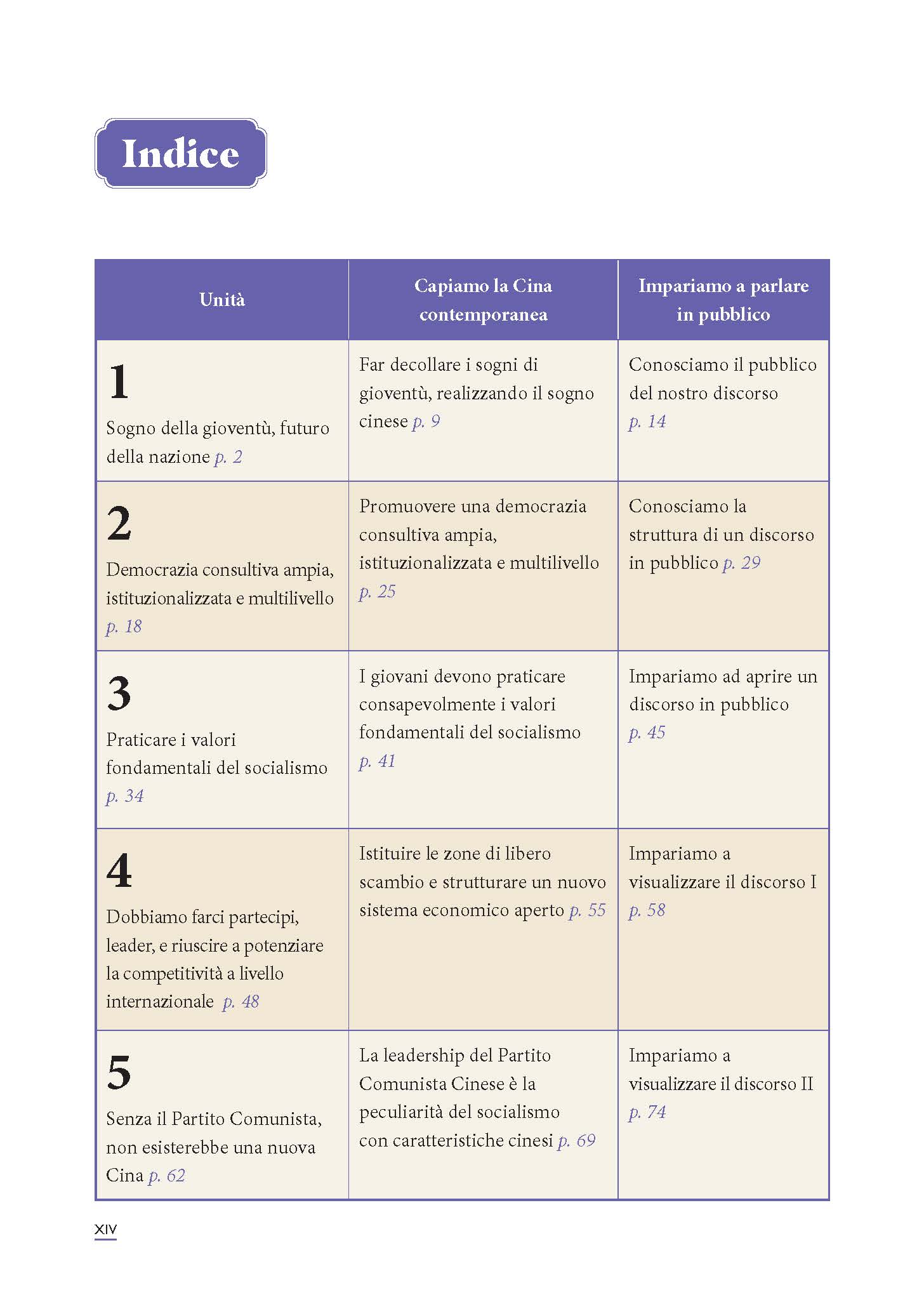 《意大利语演讲教程》共10个单元。各单元课文选自《习近平谈治国理政》第一卷、第二卷的意文版。每单元探讨习近平新时代中国特色社会主义思想的一个或多个重要方面。单元标题为:1)青年之梦想,民族之未来;2)广泛多层制度化的协商民主;3)践行社会主义核心价值观;4)做参与者、引领者,增强国际竞争力;5)没有共产党,就没有新中国;6)以转型应对新常态;7)郡县治,天下安;8)全面贯彻实施宪法,坚持推进依法治国;9)人民军队,和平卫士;10)和而不同,合作共赢。
