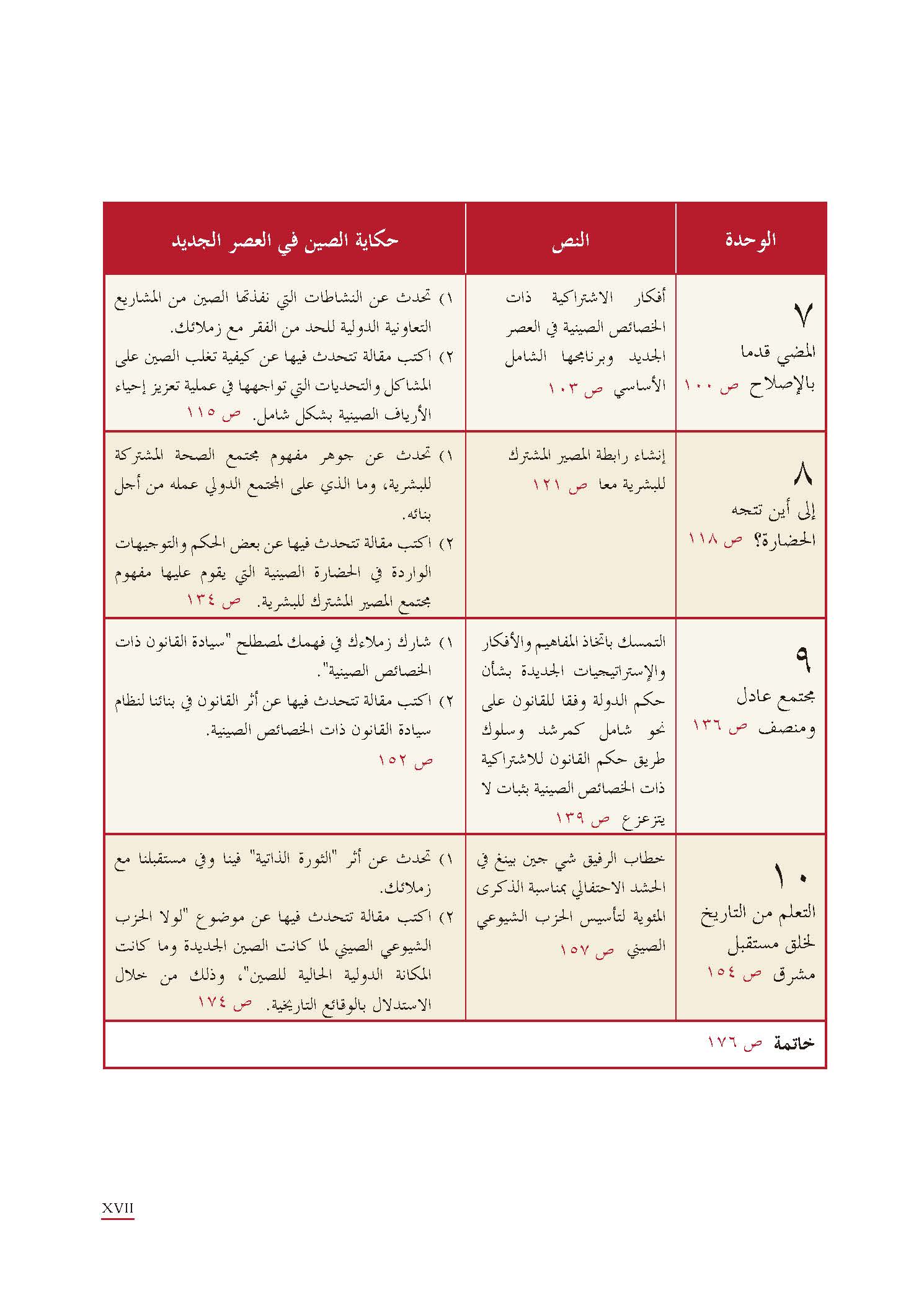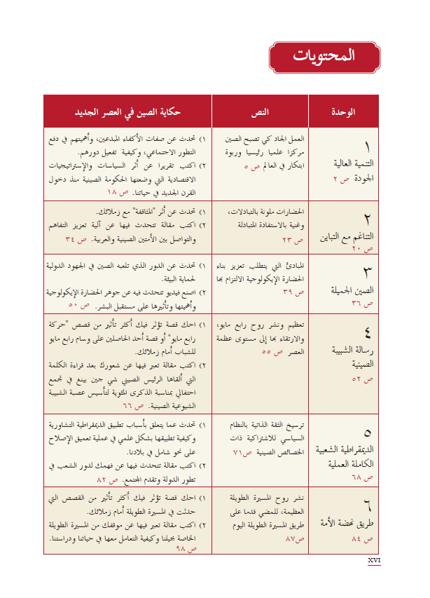 本教材共10个单元。各单元主要课文选自《习近平谈治国理政》第一卷、第二卷、第三卷和《在庆祝中国共产党成立100周年大会上的讲话》的阿拉伯文版,包括10个主题:中国青年使命;美丽中国;高质量发展;全过程人民民主;公平正义的社会;将改革进行到底;民族复兴之路;和而不同;文明走向何方;以史为鉴,开创未来。