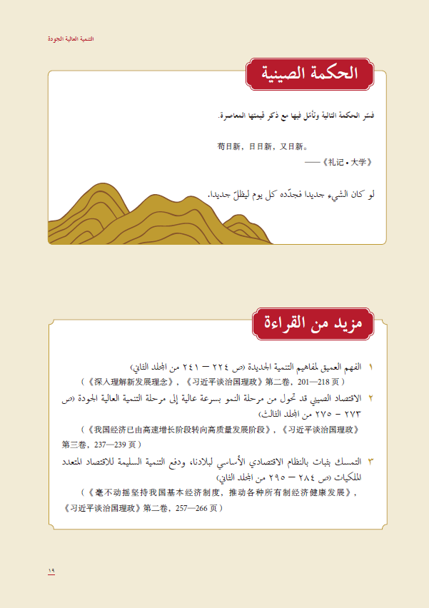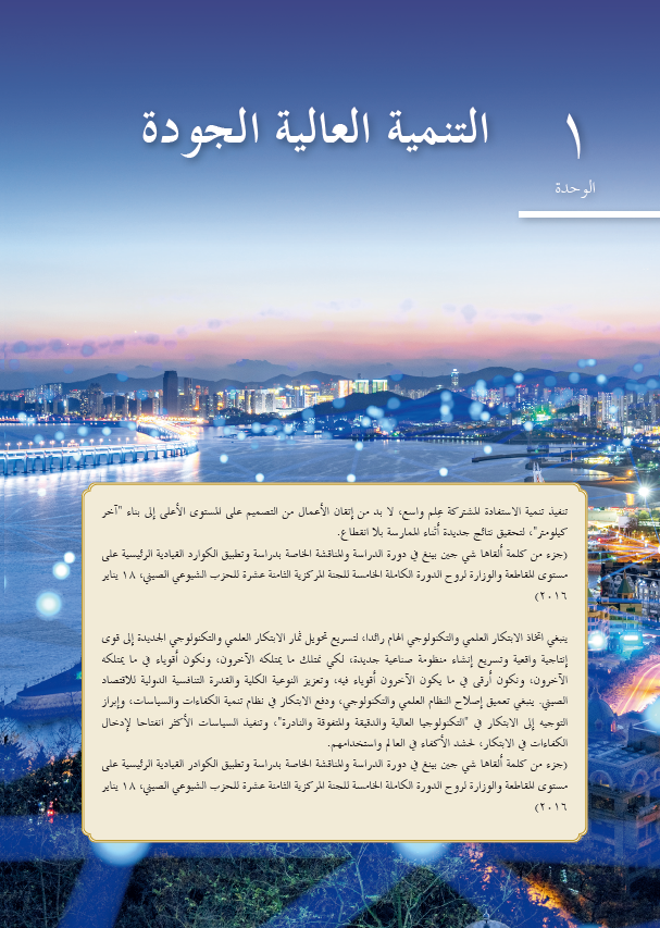 本教材共10个单元。各单元主要课文选自《习近平谈治国理政》第一卷、第二卷、第三卷和《在庆祝中国共产党成立100周年大会上的讲话》的阿拉伯文版,包括10个主题:中国青年使命;美丽中国;高质量发展;全过程人民民主;公平正义的社会;将改革进行到底;民族复兴之路;和而不同;文明走向何方;以史为鉴,开创未来。