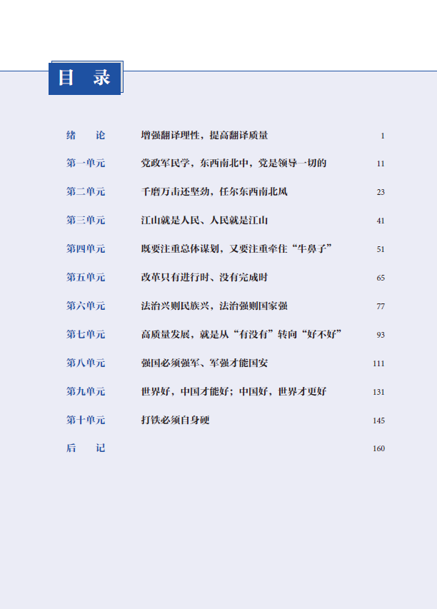 本书稿包括绪论和10个单元。绪论主要深入阐述中国时政文献的特点及翻译原则和方法。第一至第十单元所选材料主要来自《习近平谈治国理政》第一卷、第二卷、第三卷,《在庆祝中国共产党成立100周年大会上的讲话》和《中共中央关于党的百年奋斗重大成就和历史经验的决议》。每个单元探讨习近平新时代中国特色社会主义思想一个重要方面。