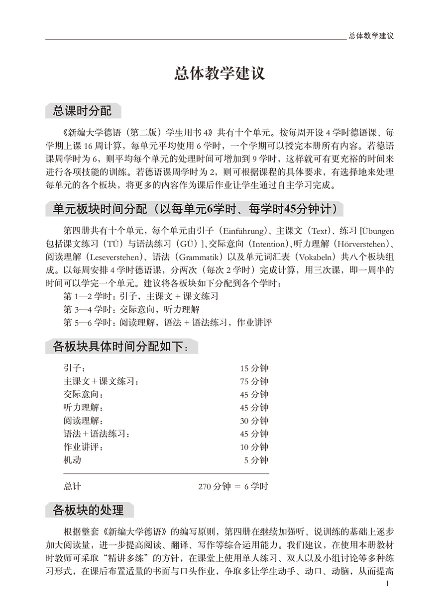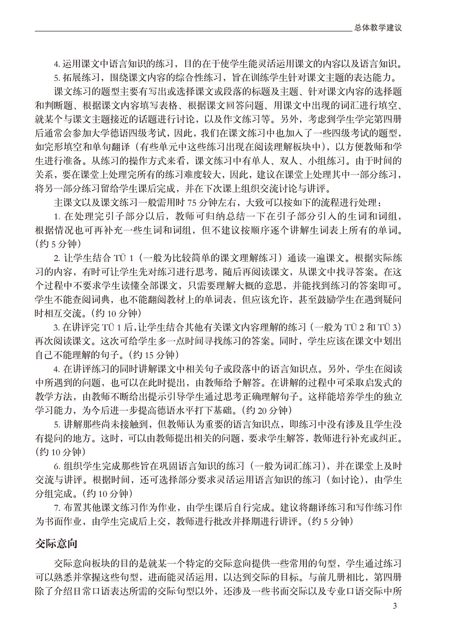 《新编大学德语(第二版)(教师手册)(4)》为《新编大学德语(第二版)(学生用书)(4)》的配套教师手册。《新编大学德语(第二版)》以高等学校理、工、文、管等各科(非德语专业)初学德语的本科生为教学对象,同时也可以作为德语语言培训基础教材使用。《新编大学德语(第二版)(教师手册)(4)》从整体结构上提出了如何处理教材各个板块的建议,还对各单元内容做了介绍,对各板块的具体内容和练习的类型做了说明并提出了组织课堂教学的具体建议。此外,本教师手册对教材所有练习给出了参考答案,对所有主课文和阅读课文提供了参考译文,对所有听力内容提供了原文和参考译文。