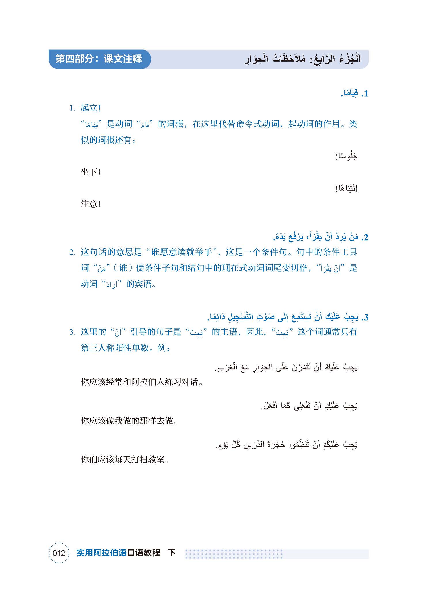 《实用阿拉伯语口语 下》根据不同的主题,共分为十二课,每课的主题与使用场景各异,分为一节阿拉伯语课、我的朋友也学阿拉伯语、我们踢球去、节日快乐、你了解阿拉伯国家的服饰吗、让我们一起去逛街、我的表不走了,该怎么办、我们去郊游怎么样、参观埃及博物馆、我想开账户、我要一间海景房、我终于要回家了的主题课文,具有很强的生活色彩与实用性。同时,每一课的结构沿袭了上册的体例,包括导入、课文、生词新句、重点注释、知识点讲解、练习与拓展阅读七大模块,其中课文、生词及句型与现实结合紧密;语法讲解清晰明了,较为详实;练习模块则包括课堂活动、口头训练与自我评估三个部分,以情景模拟与自我检测的方式,巩固学生的学习效果。