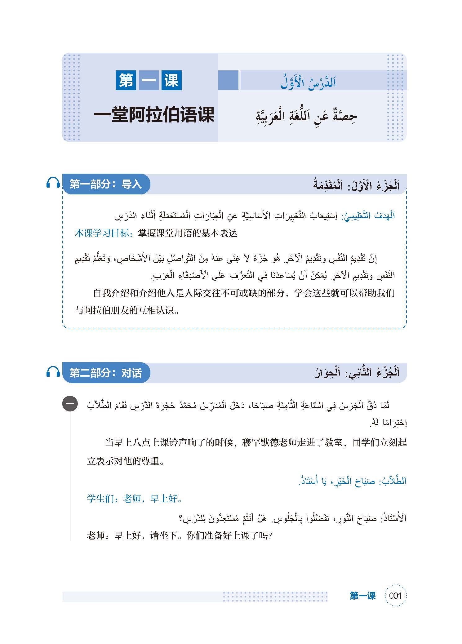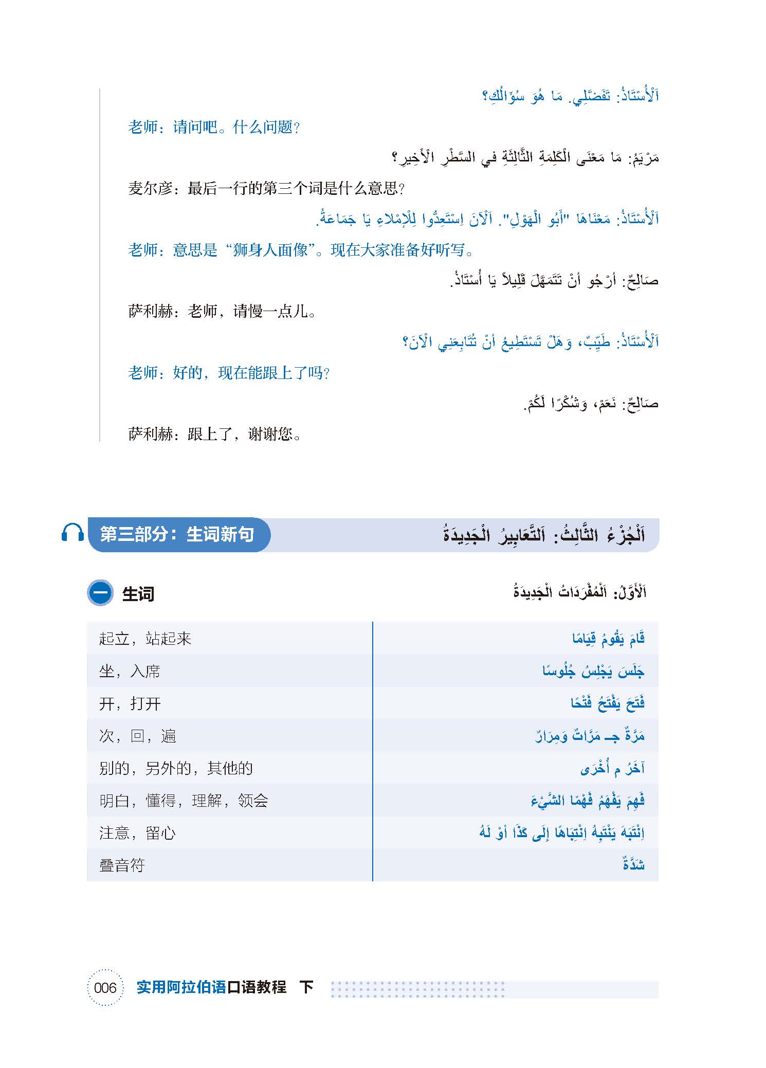 《实用阿拉伯语口语 下》根据不同的主题,共分为十二课,每课的主题与使用场景各异,分为一节阿拉伯语课、我的朋友也学阿拉伯语、我们踢球去、节日快乐、你了解阿拉伯国家的服饰吗、让我们一起去逛街、我的表不走了,该怎么办、我们去郊游怎么样、参观埃及博物馆、我想开账户、我要一间海景房、我终于要回家了的主题课文,具有很强的生活色彩与实用性。同时,每一课的结构沿袭了上册的体例,包括导入、课文、生词新句、重点注释、知识点讲解、练习与拓展阅读七大模块,其中课文、生词及句型与现实结合紧密;语法讲解清晰明了,较为详实;练习模块则包括课堂活动、口头训练与自我评估三个部分,以情景模拟与自我检测的方式,巩固学生的学习效果。