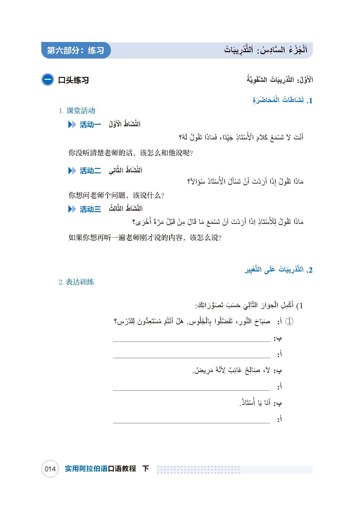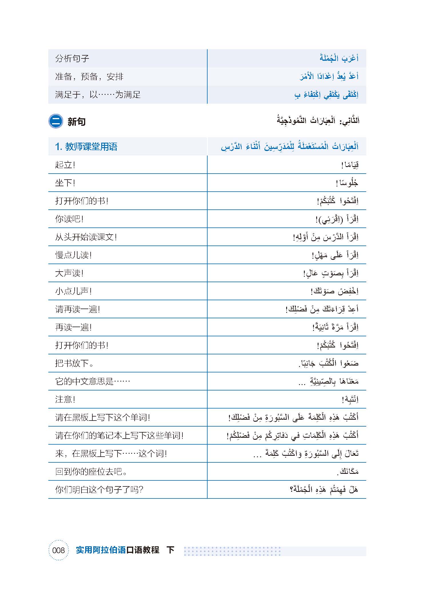 《实用阿拉伯语口语 下》根据不同的主题,共分为十二课,每课的主题与使用场景各异,分为一节阿拉伯语课、我的朋友也学阿拉伯语、我们踢球去、节日快乐、你了解阿拉伯国家的服饰吗、让我们一起去逛街、我的表不走了,该怎么办、我们去郊游怎么样、参观埃及博物馆、我想开账户、我要一间海景房、我终于要回家了的主题课文,具有很强的生活色彩与实用性。同时,每一课的结构沿袭了上册的体例,包括导入、课文、生词新句、重点注释、知识点讲解、练习与拓展阅读七大模块,其中课文、生词及句型与现实结合紧密;语法讲解清晰明了,较为详实;练习模块则包括课堂活动、口头训练与自我评估三个部分,以情景模拟与自我检测的方式,巩固学生的学习效果。